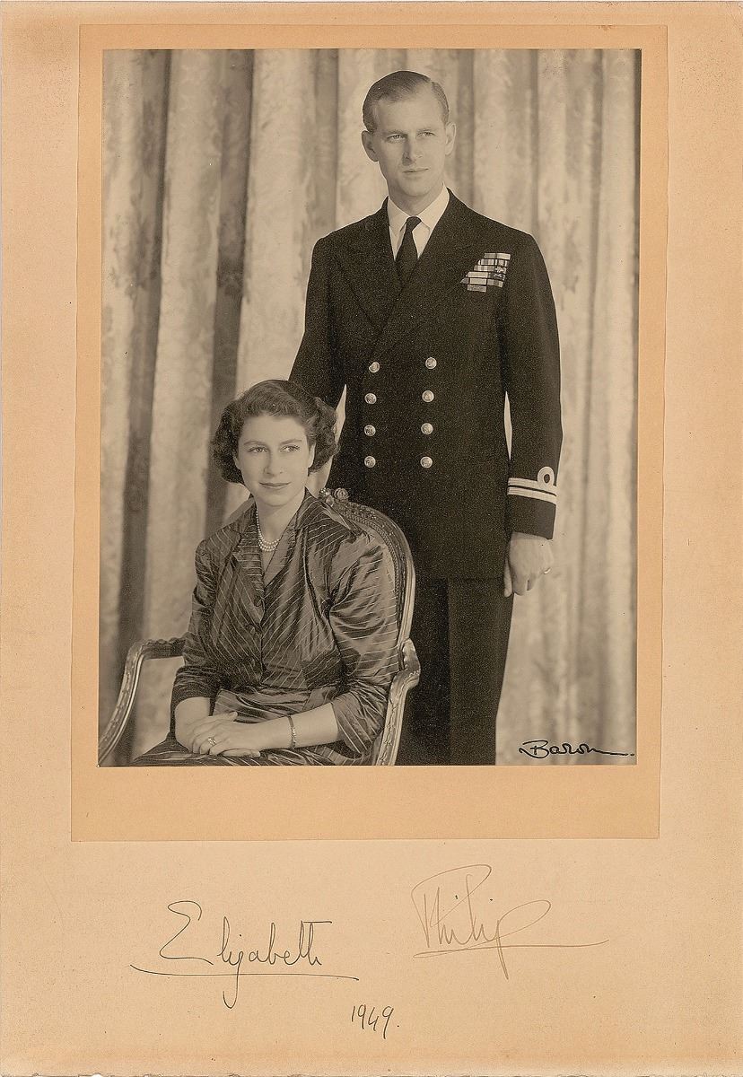 Vintage matte-finish 6 x 8 portrait of the royal couple, affixed to the original 8.25 x 12 studio mount, signed on the mount in fountain pen, “Elizabeth, 1949” and “Philip.” Also signed on the photo in black ink by the photographer, “Bruno.” Reverse bears a studio photography stamp. Mounted and in fine condition, with areas of light toning to the mount.