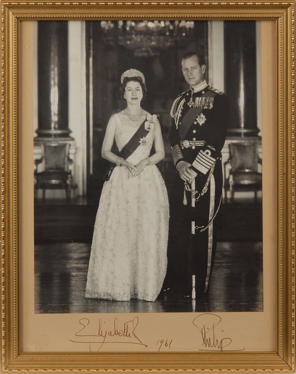 Superb vintage matte-finish 7 x 8.5 full-length portrait of Queen Elizabeth with Prince Philip, affixed to its original mount, signed on the mount in fountain pen, "Elizabeth 1961," and in black ink, "Philip." Reverse of frame bears collector's notations indicating that the signatures were obtained during the Royal Tour of Italy in 1961. Framed and in fine condition.