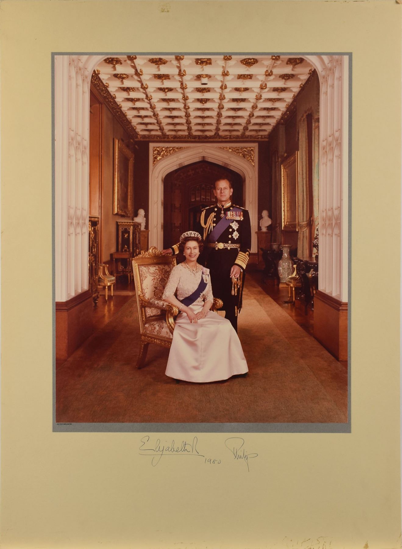 Outstanding color matte-finish 16 x 20 full-length portrait of Queen Elizabeth and Prince Philip by Peter Grugeon, affixed to its original 22 x 30 mount, signed on the mount in black ink, "Elizabeth R., 1980" and "Philip." In fine condition, with soiling to the edges of the mount, easily matted out to create a stunning display. Unquestionably the largest signed photo of the Royal couple that we've ever offered.