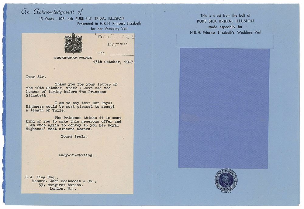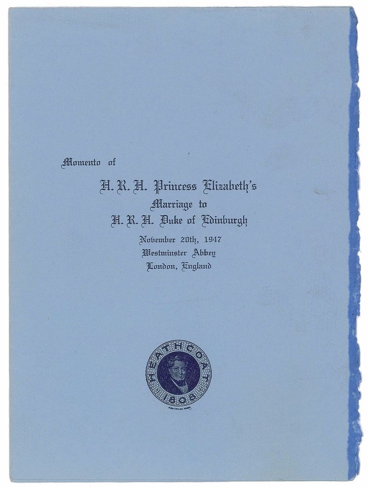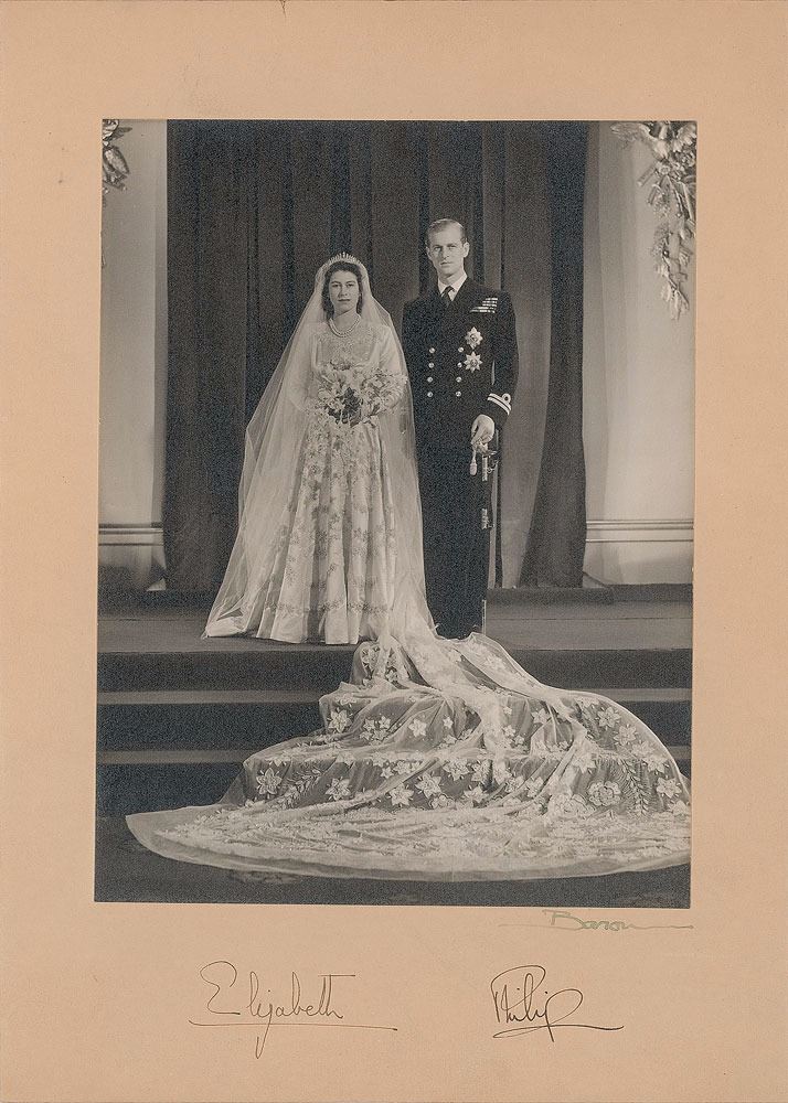 Beautiful matte-finish 6.5 x 8.5 wedding portrait of Queen Elizabeth and Prince Philip by Baron, affixed to its original 8.5 x 12 mount, signed on the mount in fountain pen, "Elizabeth" and "Philip." Also signed by the photographer. In fine condition, with a trivial ding to the top edge and subtle silvering to dark areas of the image. Accompanied by a folder containing a memento of the wedding, a cut from the bolt of pure silk bridal illusion made for Elizabeth's wedding veil.