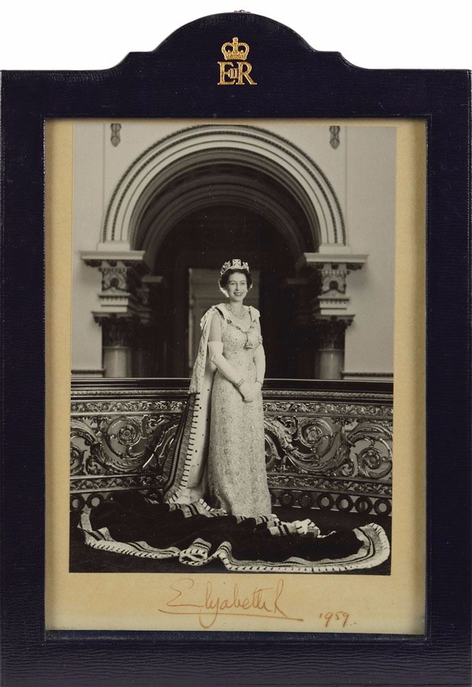 Exceptional pairing of official portraits: a matte-finish 6.75 x 9.5 portrait of Queen Elizabeth affixed to its original 8 x 11 mount, signed on the mount in fountain pen, "Elizabeth R, 1959"; and a matte-finish 6.75 x 9.5 portrait of Prince Philip affixed to its original 8 x 11 mount, signed on the mount in fountain pen, "Philip, 1959." Both are displayed in their blue leather 10 x 14 presentation frames by H. H. Plante, London, each gilt stamped at the top with their royal crest. In overall fine condition, with mild uniform toning and each signature a shade or two light.