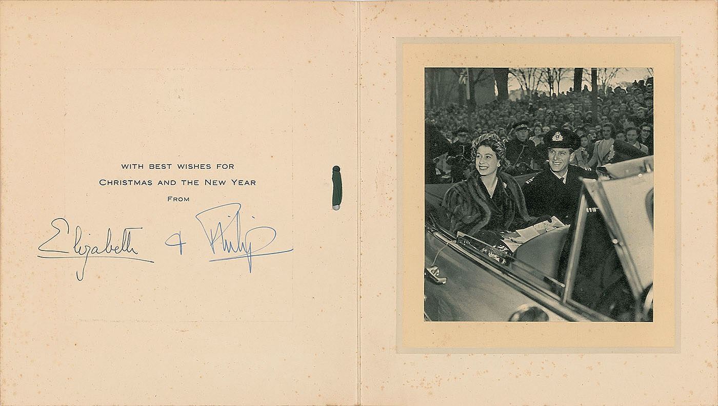 Royal Christmas and New Year card with an embossed Order of the Garter seal on the front, measures 13.5 x 7.5 open, with the inside bearing a photo of Queen Elizabeth II and Prince Philip smiling from an automobile, signed on the adjacent page in black ink, “Elizabeth,” and in fountain pen, "& Philip." Card retains its original white-and-green ribbon. In very good condition, with scattered foxing, heaviest to the front of the card.