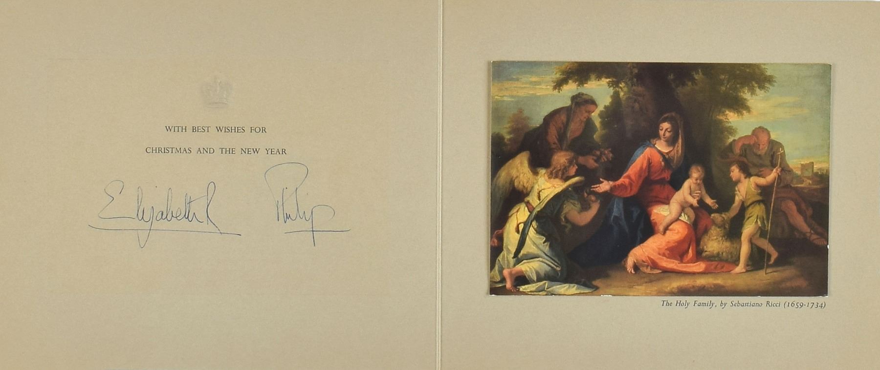 Uncommon Royal Christmas and New Year's card from 1958, with a gilt-embossed crown on the front, measuring 18.25 x 7.75 open, featuring a color image of Sebastiano Ricci's painting The Holy Family, signed on the adjacent page in fountain pen, "Elizabeth R" and "Philip." In fine condition.