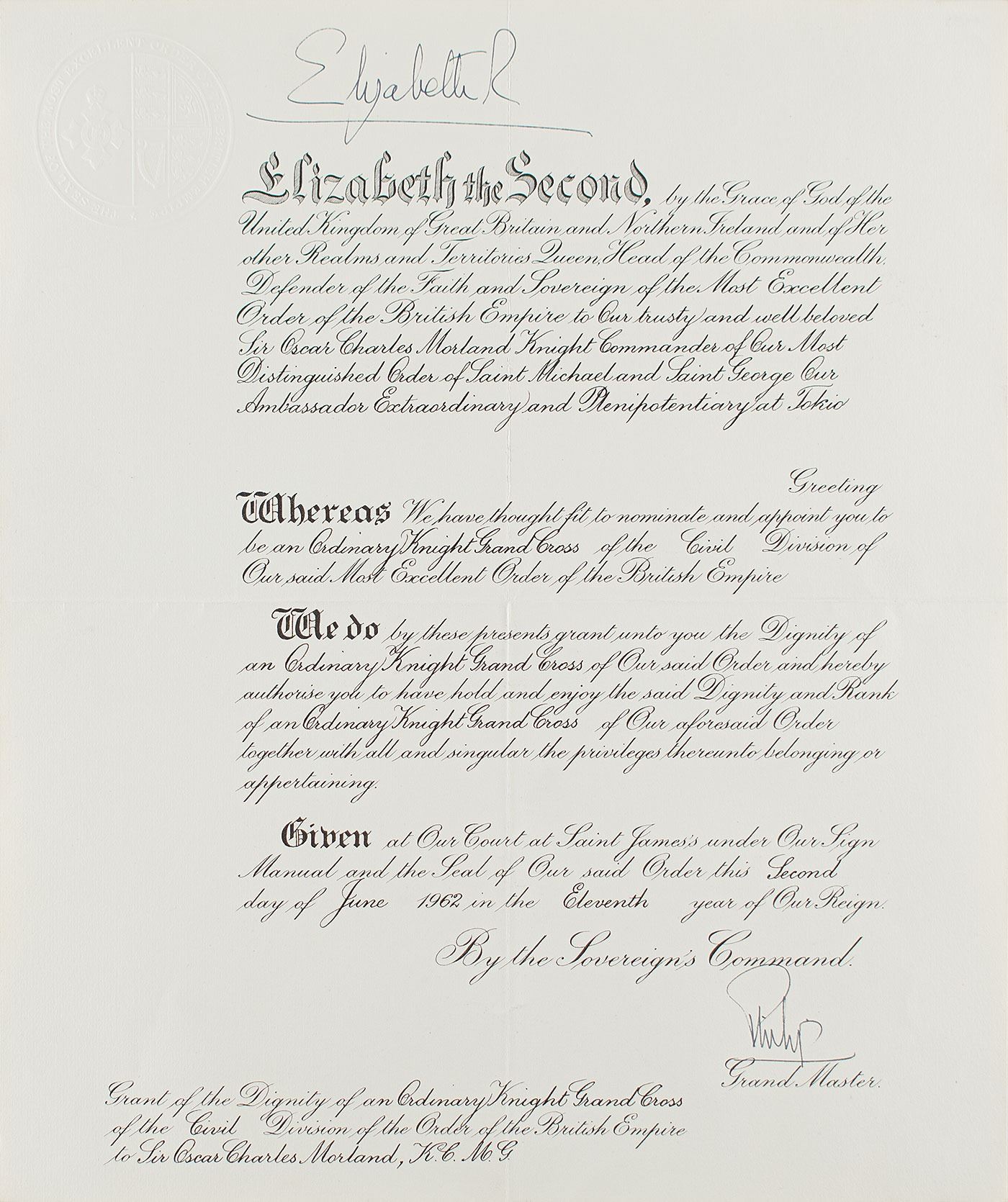 Partly-printed DS, signed “Elizabeth R” and "Philip," one page, 12.75 x 15.25, June 2, 1962. Queen Elizabeth II grants "the Dignity of an Ordinary Knight Grand Cross of the Civil Division of the Order of the British Empire to Sir Oscar Charles Moreland, K.C.M.G." Signed at the head in fountain pen by Queen Elizabeth II and countersigned at the conclusion by Prince Philip. In fine condition, with intersecting folds.