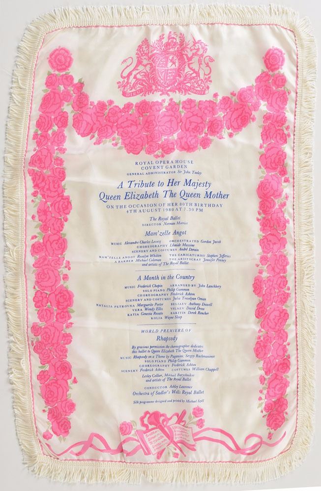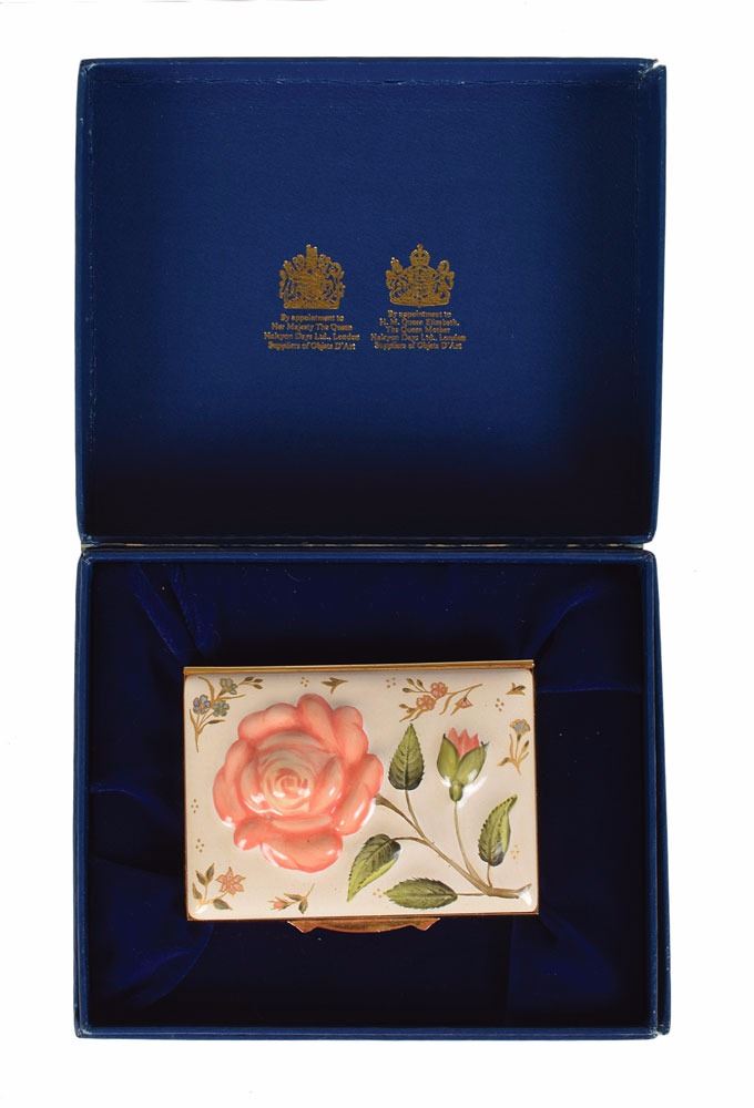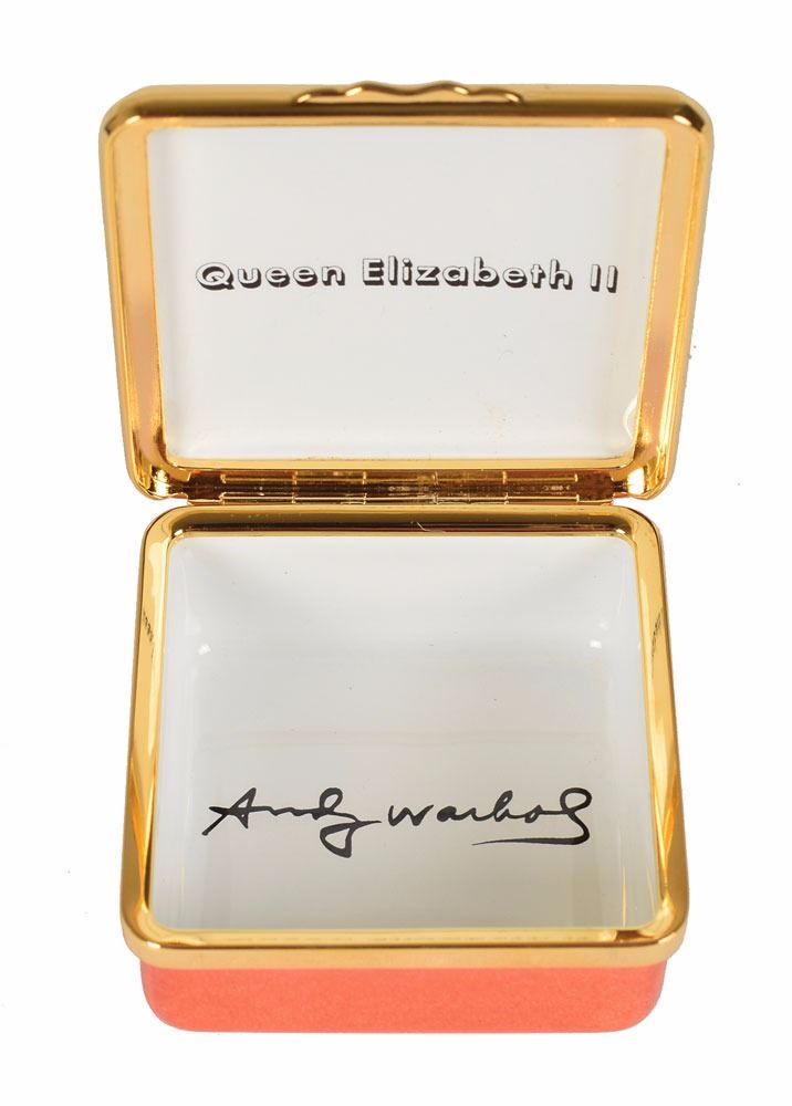 Two small limited edition enameled boxes made by Halcyon Days in Bilston, England: a music box commemorating the Queen Mother's 85th birthday on August 4, 1985, measuring 3 x 2 x 1.5, numbered 184/250, which plays Chopin's 'Grande Valse Brillante' when opened; and a trinket box featuring Andy Warhol's 1985 portrait of Queen Elizabeth II, measuring 2 x 2 x 1, numbered 141/500. In overall fine condition. Accompanied by the original boxes and certificates of authenticity. Also accompanied by a 14 x 20 silk program for the tribute to the Queen Mother at the Royal Opera House, Covent Garden, for her 80th birthday on August 4, 1980.