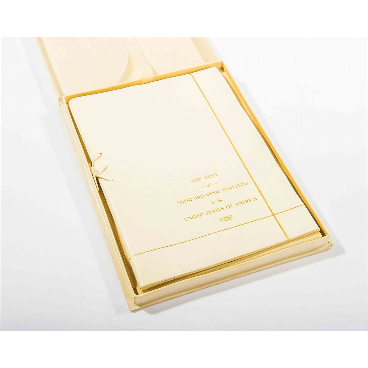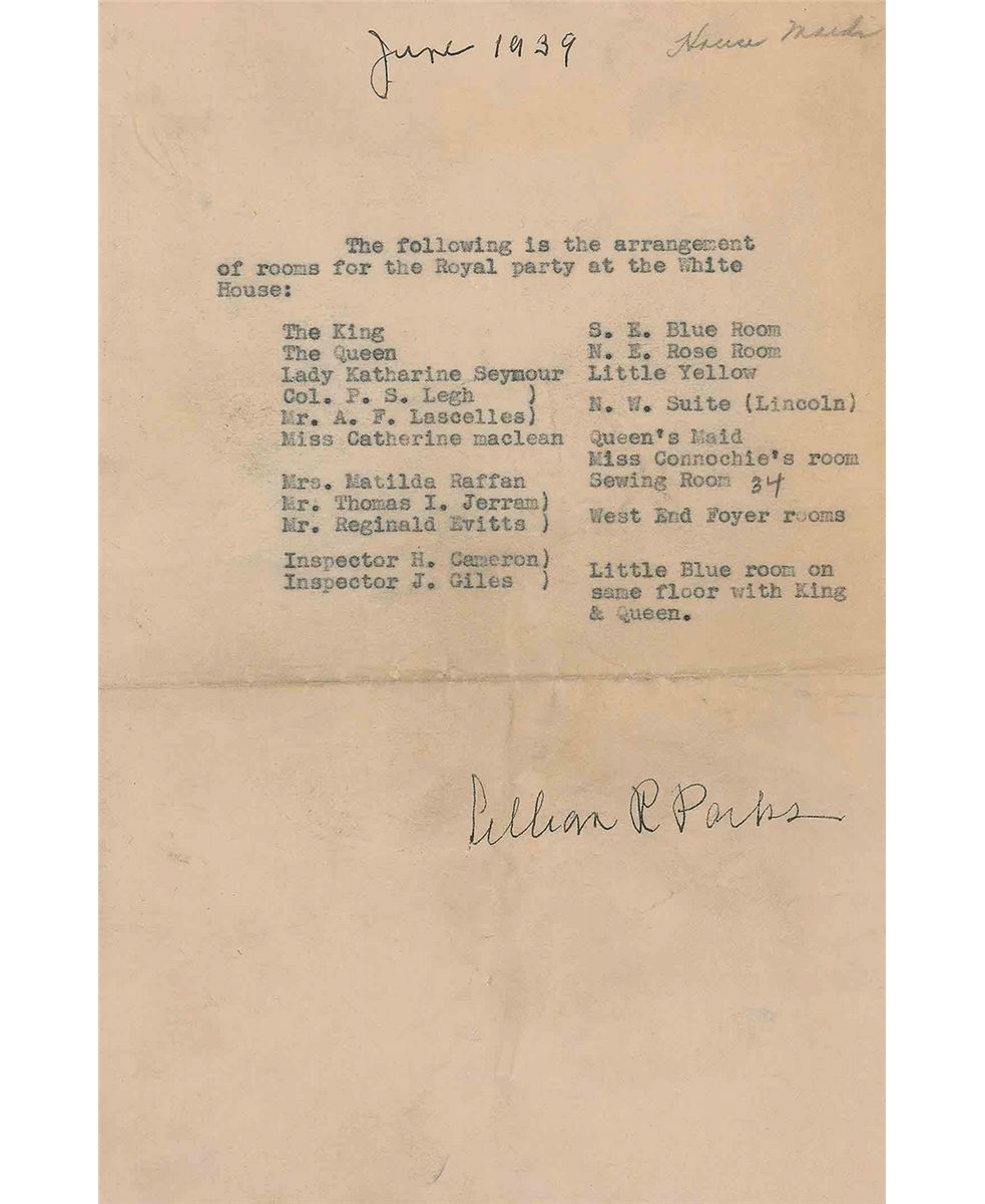 Queen Elizabeth’s elegant copy of the itinerary for the famous British Royal Visit to the United States on June 7-12, 1939. Beautifully printed itinerary, 6 x 9, bound in quality off-white doeskin, is embossed on the cover, “The Visit of Their Britannic Majesties to the United States of America.” Inside lists the members of the traveling royal party, an incredibly detailed narrative of their travel and social arrangements, and the distances and map of their train travel from the White House all the way to Hyde Park. Accompanied by a handwritten letter of provenance on White House letterhead written by Lillian Rogers Parks, who was a best selling author as well as housekeeper and seamstress at the White House for over 30 years, from President Hoover through President Eisenhower. Her note reads, in full: “This is a copy of the personal itinerary used by the Queen. Queen Elizabeth used this copy during her visit at the White House in 1939. God save the Queen.” Also included is a typed room arrangement for the royal party at the White House, dated June 1939, and signed by Parks; a typed manuscript, signed by Parks, about the June 8, 1939 State Dinner, listing the menu and describing the challenges faced by the White House chefs, and a red, white, and blue commemorative ribbon. In exceptionally fine condition. With Europe on the brink of war, President Roosevelt invited the King and Queen to the United States to help them win American support and to build a stronger alliance between the US and England, which was strained at times. Roosevelt himself planned every minute of the visit, which would be the first time a reigning British monarch had set foot on American soil. Once FDR finally got the royal couple out of the White House and onto his Hyde Park estate, he famously served them American hot dogs. An important piece of both royal and presidential history.