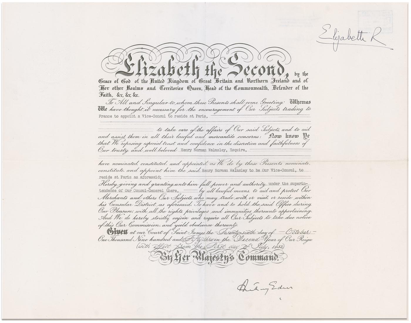 DS, signed “Elizabeth R,” one page, 21 x 16.5, October 26, 1953. Her Royal Highness appoints a representative in Paris. In part: “Elizabeth the Second, by the Grace of God of the United Kingdom of Great Britain and Northern Ireland and of the other Realms and Territories Queen, Head of the Commonwealth, Defender of the Faith…Whereas We have thought it necessary for the encouragement of Our Subjects trading to France to appoint a Vice-Consul to reside at Paris to take care of the affairs of Our said Subjects and to aid and assist them in all their lawful and mercantile concerns: Now know Ye that We reposing special trust and confidence in the discretion and faithfulness of Our Trusty and well beloved Henry Norman Walmsley, Esquire…and appoint him…to reside at Paris as aforesaid.” In fine condition, with two central horizontal and vertical folds, light handling wear, and show-through from stampings on the reverse affecting the top of her name. A very early document from the first year of her reign in outstanding condition.