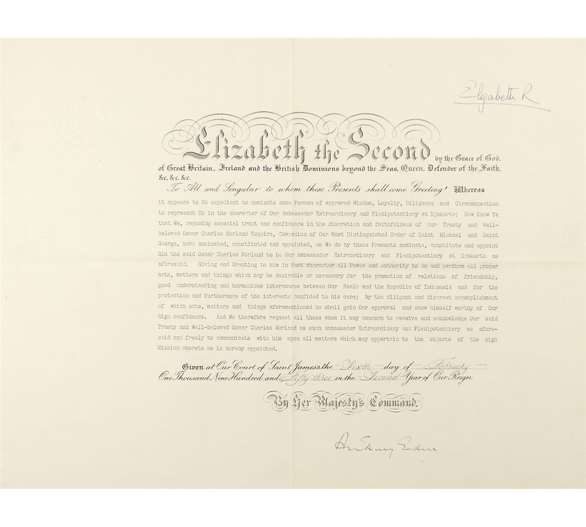 DS, signed “Elizabeth R,” one page, 21 x 16.5, February 6, 1953. The Queen appoints “Oscar Charles Morland to be Our Ambassador Extraordinary and Plenipotentiary at Djakarta…Giving and Granting to him in that character all Power and Authority to do and perform all proper acts, matters and things which may be desirable or necessary for the promotion of relations of friendship, good understanding and harmonious intercourse between Our Realm and the Republic of Indonesia.” In fine condition, with central vertical and horizontal storage folds. Unusual in that the embossed royal seal is that of her father, George VI, who had died exactly one year prior to the signing of this document, on February 6, 1952. A document in fantastic condition from Elizabeth’s early years.