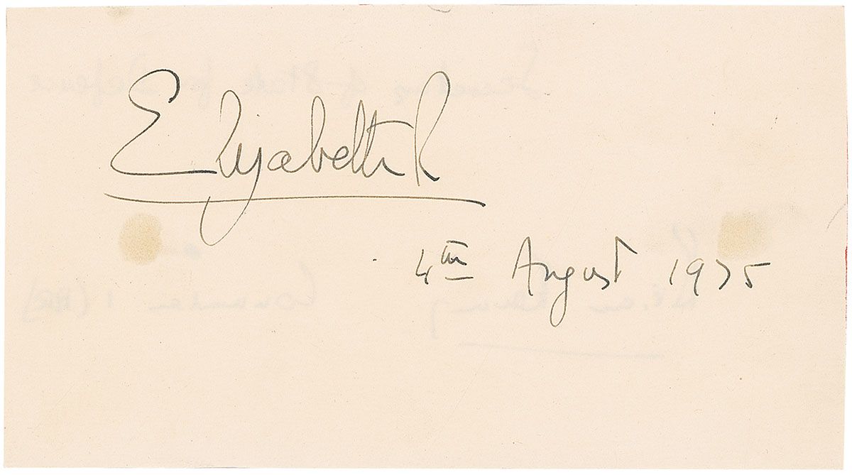 Large fountain pen signature, “Elizabeth R, 4th August 1975,” on an off-white 7.75 x 4.25 sheet. In fine condition, with two circular areas of show-through from adhesive to reverse.