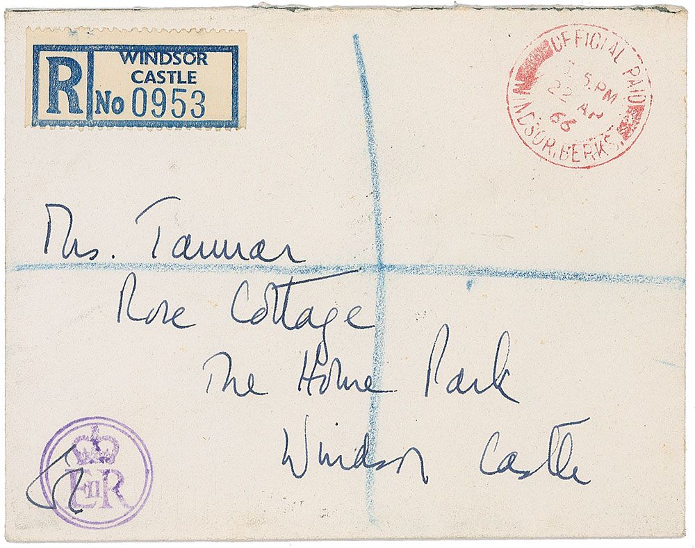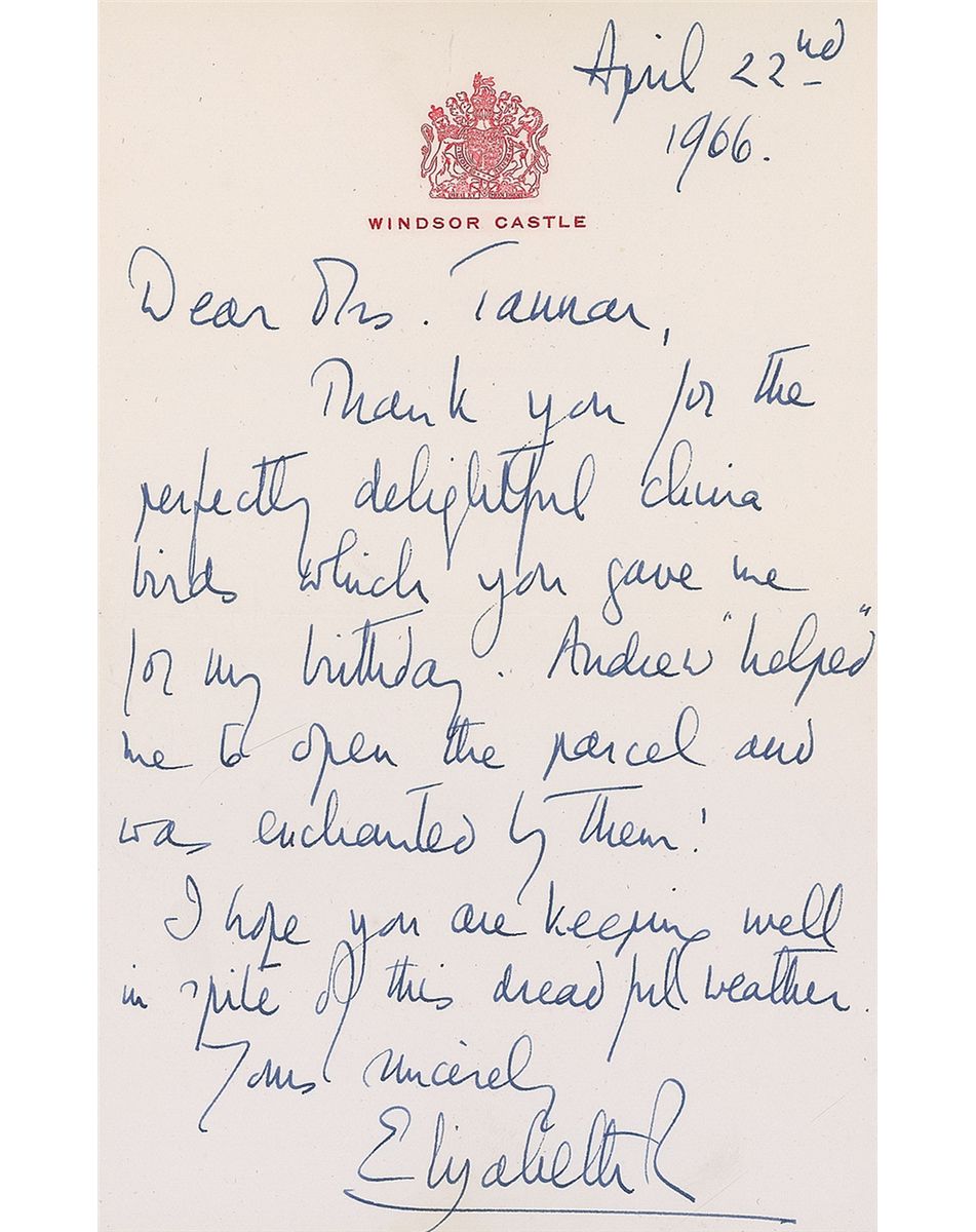 ALS signed “Elizabeth R,” one page, 4.75 x 7.5, Windsor Castle letterhead, April 22, 1966. Letter to Mrs. Tannar. In full: “Thank you for the perfectly delightful china birds which you gave me for my birthday. Andrew ‘helped’ me to open the parcel and was enchanted by them! I hope you are keeping well in spite of this dreadful weather.” In fine condition. Accompanied by the original mailing envelope, addressed in Elizabeth’s own hand. Andrew would have been six years old at the time of writing. Quite rare in handwritten letters, this is the first we have offered in over five years.