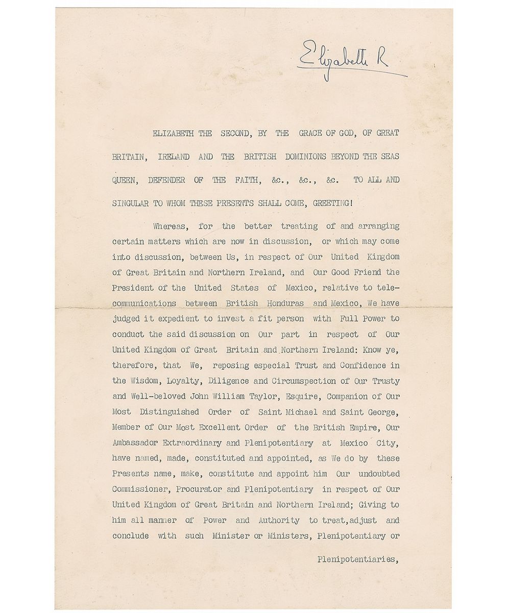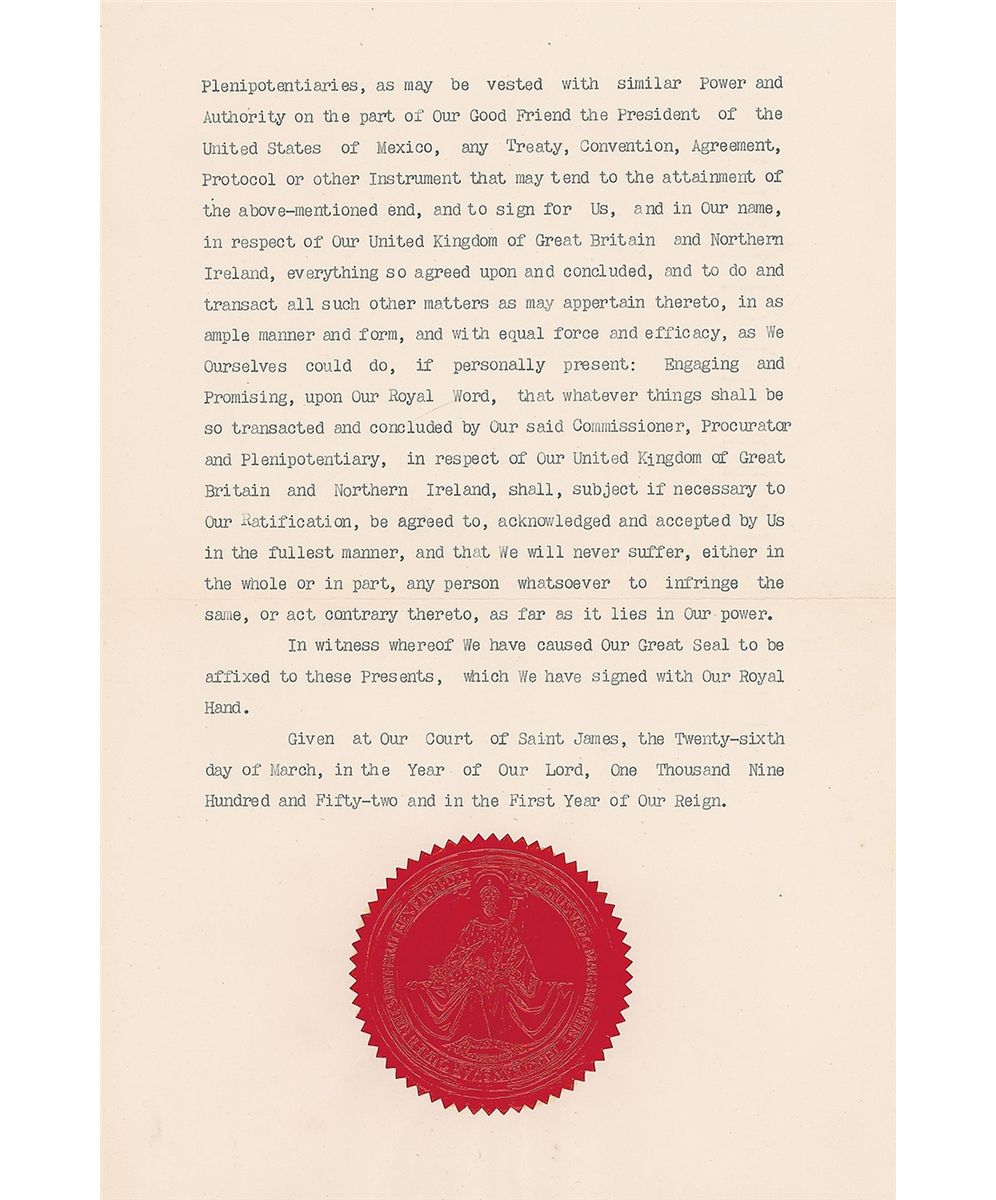 Very early DS, signed “Elizabeth R,” two pages on two adjoining sheets, 9.75 x 14.75, March 26, 1952. Official diplomatic appointment from the first full month of her reign. In part: “In respect of Our United Kingdom of Great Britain and Northern Ireland, and Our Good Friend the President of the United States of Mexico, relative to telecommunications between British Honduras and Mexico, We have judged it expedient to invest a fit person with Full Power to conduct the said discussion on Our part…John William Taylor…We do by these Presents name, make, constitute and appoint him Our undoubted Commissioner.” The crisply embossed red seal of George VI is affixed at the conclusion, as the newly crowned Queen Elizabeth’s would not yet have been made. In fine condition, with expected document wear and soiling to the first page.