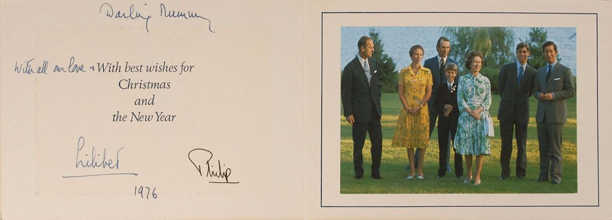 Wonderful royal Christmas card from 1976, measures 17 x 6, bearing a color family photo of Queen Elizabeth and Prince Philip with Princes Charles and Andrew, and Princess Anne, Mark Phillips, and their son, signed and inscribed to the Queen Mother in fountain pen, “Darling Mummy, with all our love &…Lilibet, 1976." Also bears an autopen signature of Prince Philip. In fine condition, with light toning to the front and light soiling to the signed panel. Pre-certified PSA/DNA.