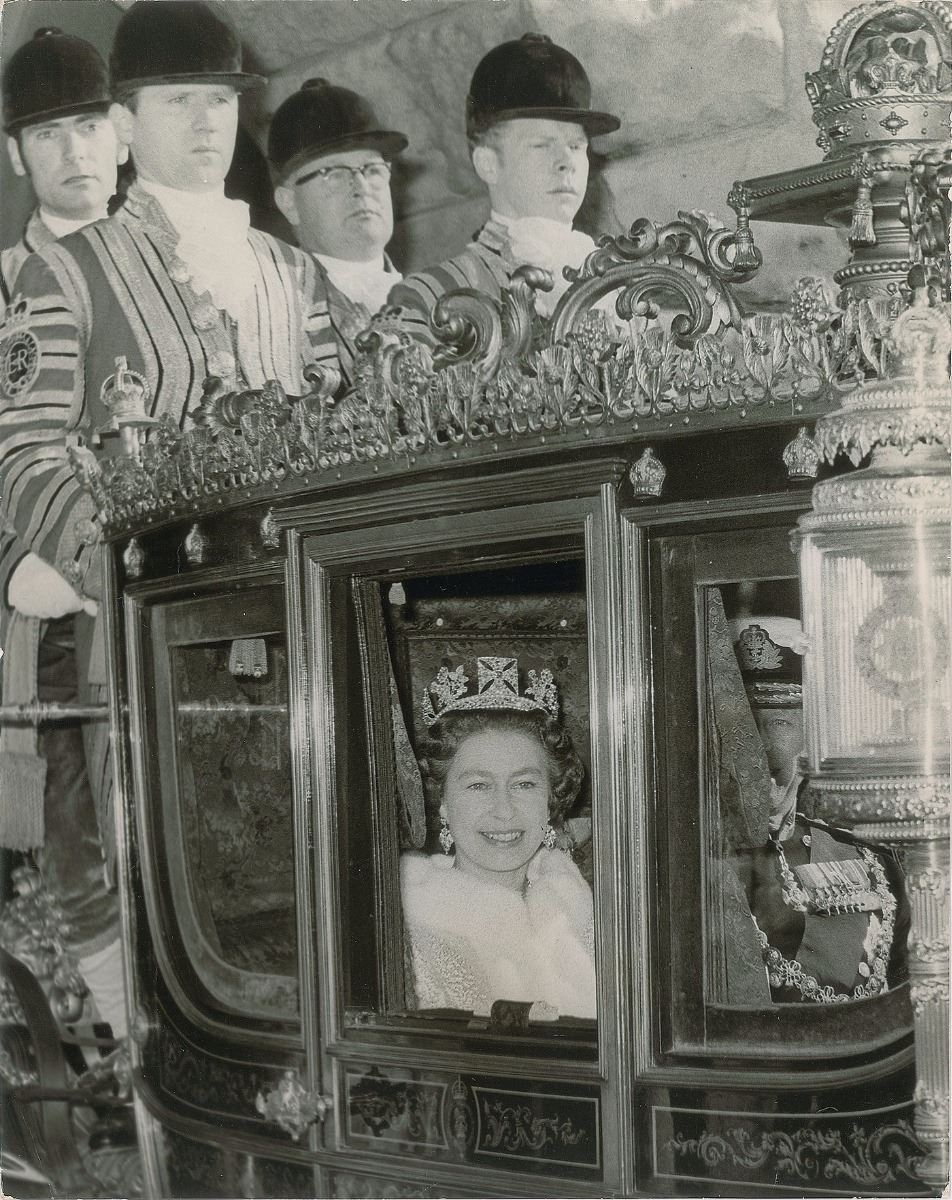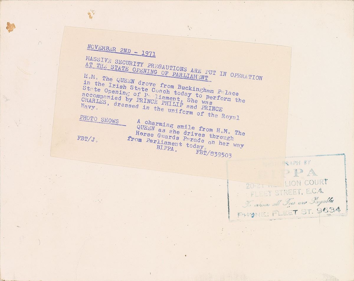 Wonderful original vintage matte-finish 8 x 10 silver gelatin photo of Queen Elizabeth traveling in the Irish State Coach in November 1971, en route to performing the State Opening of Parliament. Reverse bears an affixed caption and "Bippa" photographer's stamp. In fine condition.