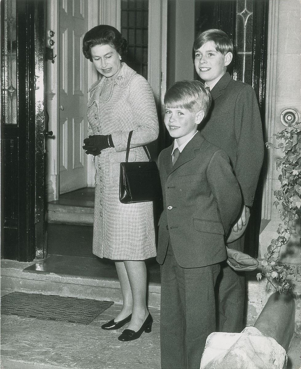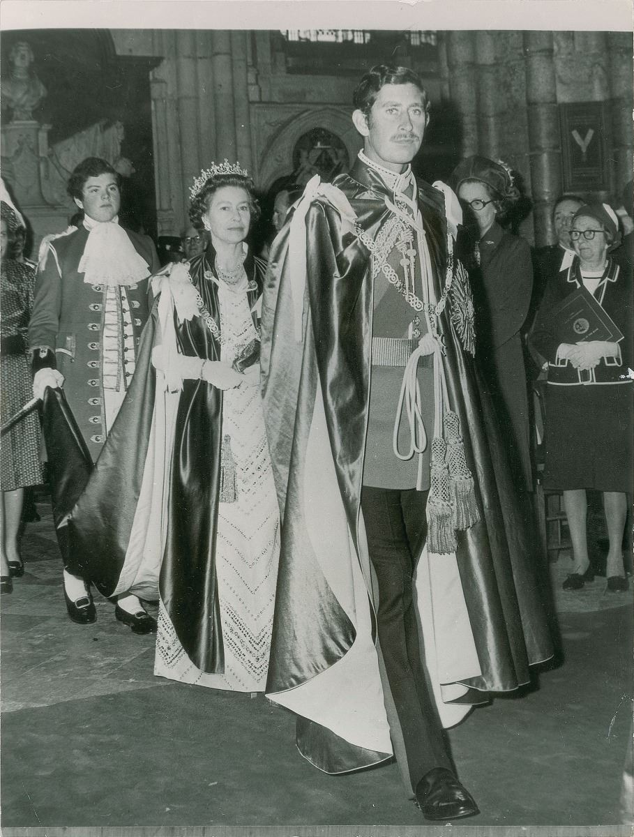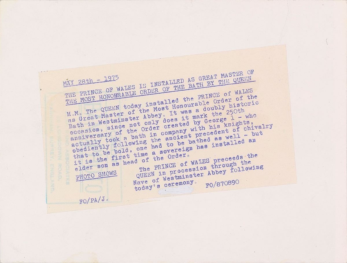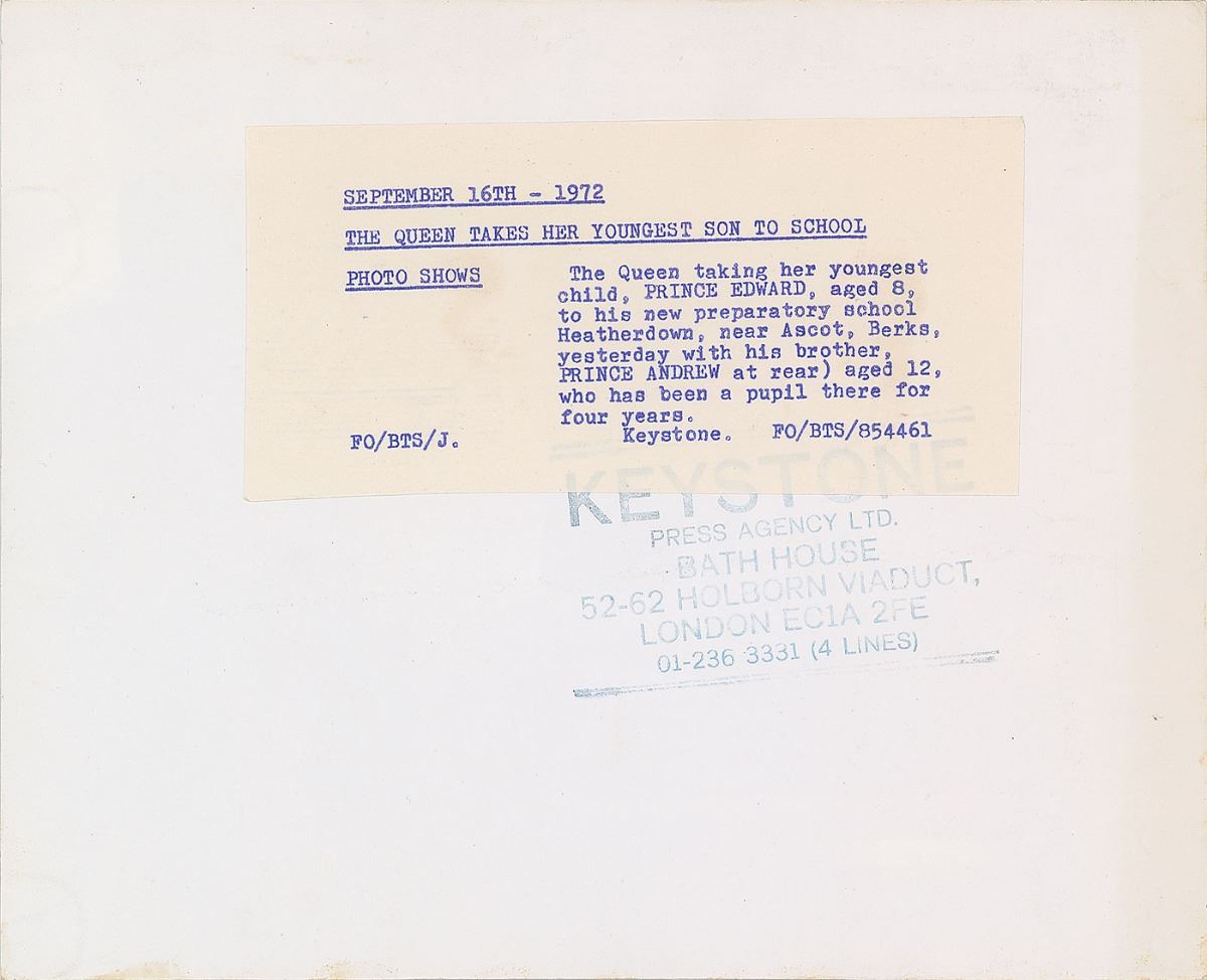Two original vintage glossy silver gelatin photos of Queen Elizabeth with her family, including: a 7 x 9.5 photo of Queen Elizabeth and Prince Charles on May 28, 1975, during the ceremony at Westminster Abbey in which Charles was installed as Great Master of the Most Honourable Order of the Bath; and an 8 x 10 photo of the queen taking her children Prince Edward and Prince Andrew to school on September 16, 1972. Both bear affixed captions on the reverse. In overall fine condition, with a bit of light creasing, and trimmed edges to the smaller photo.