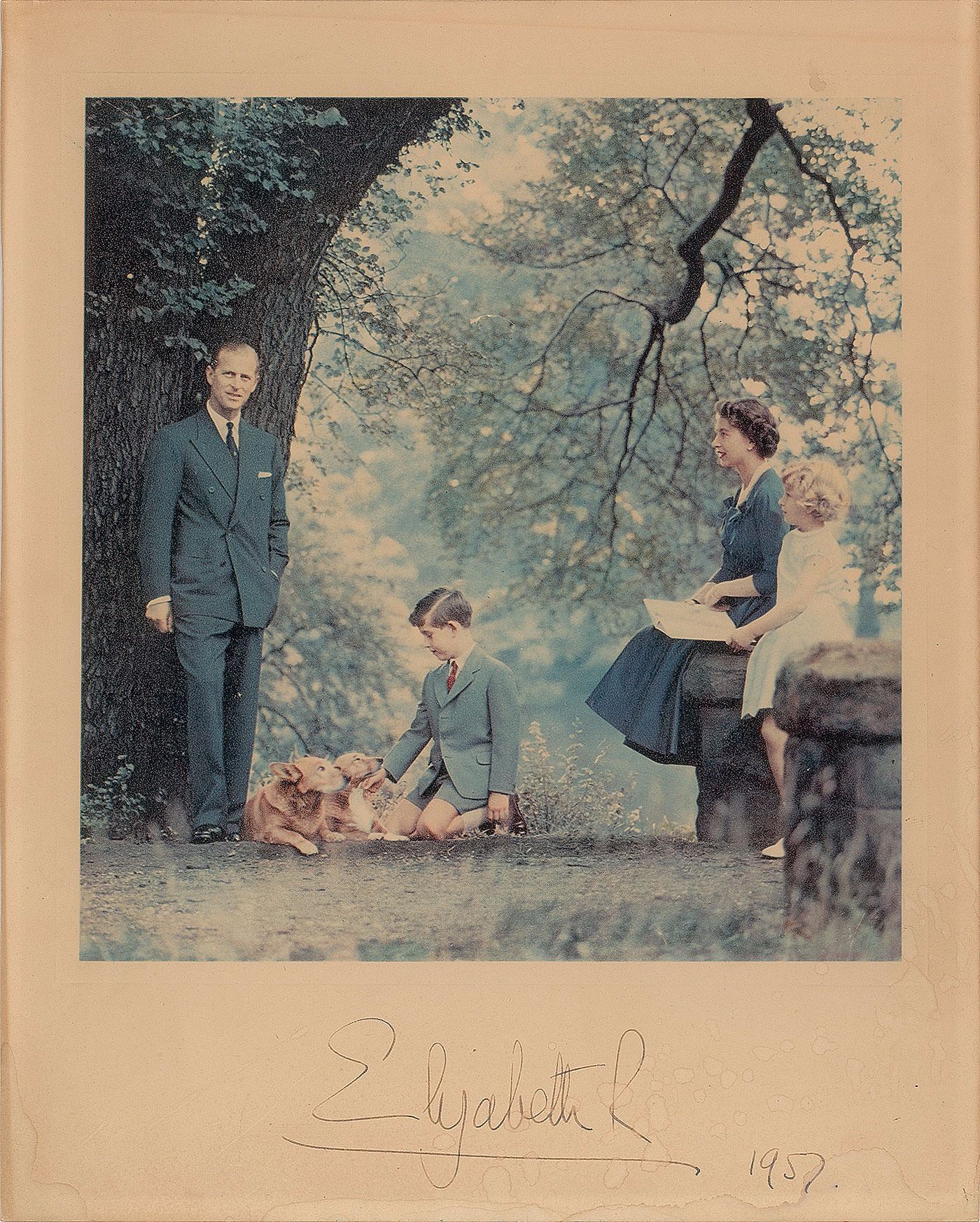 Appealing color matte-finish 7.5 x 9.25 photo of Prince Philip and Queen Elizabeth posing with their children and dogs outside, neatly removed from a 1957 Royal holiday card, signed in the lower border in black ink, "Elizabeth R, 1957." In very good to fine condition, with some light toning from prior display, and some light spotty staining in the signature area.