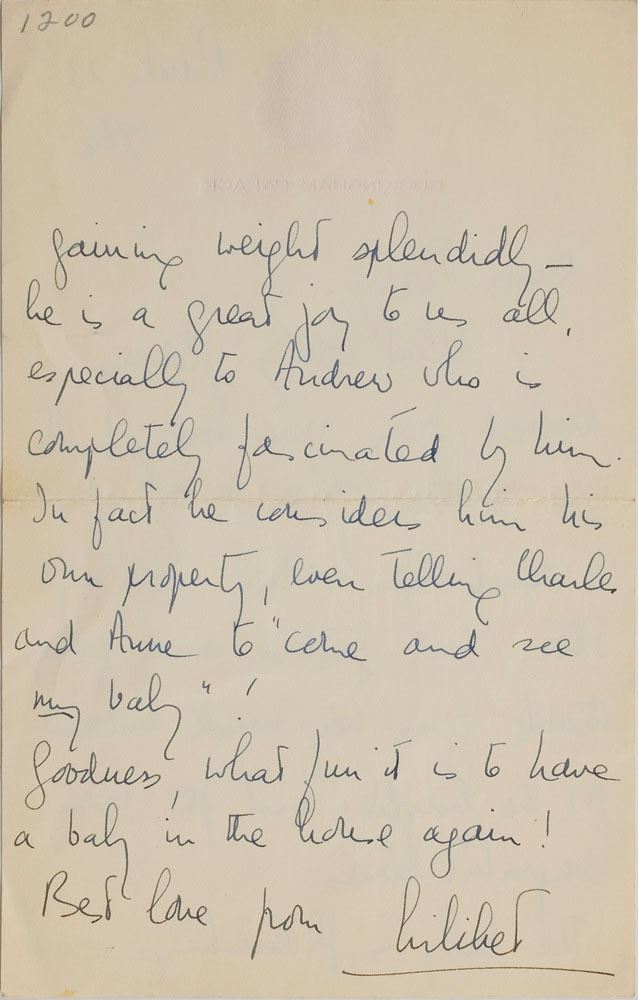 ALS signed “Lilibet,” one page both sides, 4.75 x 7.5, Buckingham Palace letterhead, March 23, 1964. Letter to Mary, in full: "What lovely flowers arrived from you today! It was extremely kind of you to send them when all my others had faded and gone, thank you very much indeed for the thoughts and for your congratulations. The baby is flourishing and gaining weight splendidly—he is a great joy to us all, especially to Andrew who is completely fascinated by him. In fact he considers him his own property, even telling Charles and Anne to 'come and see my baby!' Goodness, what fun it is to have a baby in the house again!" In fine condition. The fourth child of Queen Elizabeth and Prince Philip, Edward Antony Richard Louis was born at Buckingham Palace on March 10, 1964, less than two weeks before this letter was written. A fabulous handwritten letter from the joyous new mother.