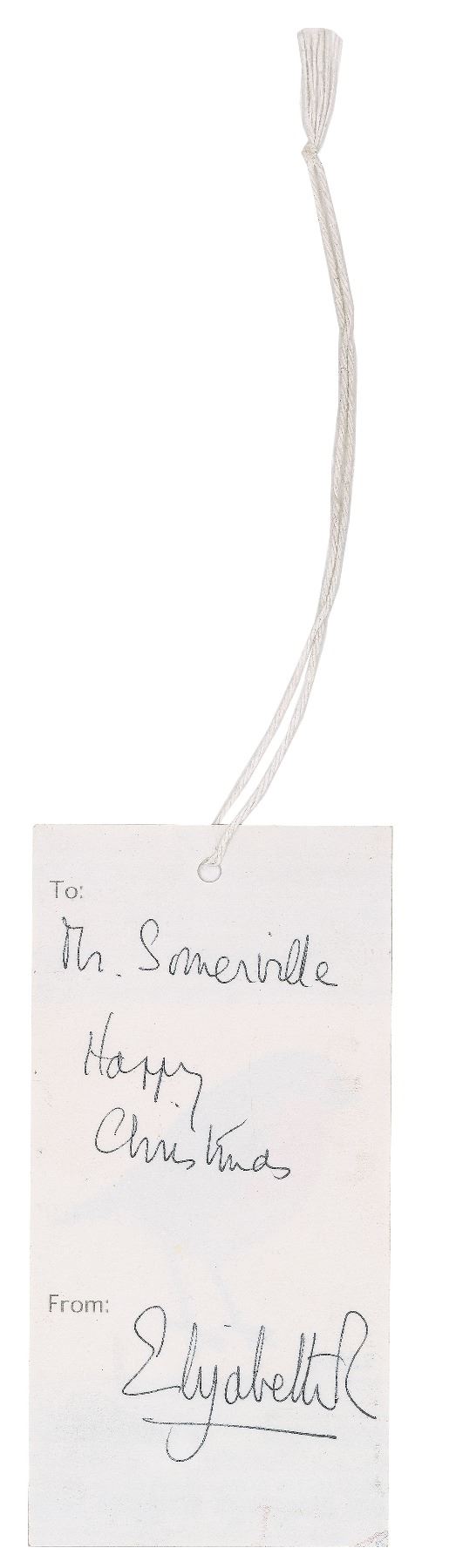 Gift tag featuring a colorful bird design, 2.25 x 4.75, signed and inscribed in black ballpoint to the famed milliner Philip Somerville, "Mr. Somerville, Happy Christmas, Elizabeth R." The front is dated "2001" in another hand. In fine condition, with a small area of surface loss to the picture side of the tag. Somerville was widely known for his hat designs worn by Queen Elizabeth II and Diana, Princess of Wales.
