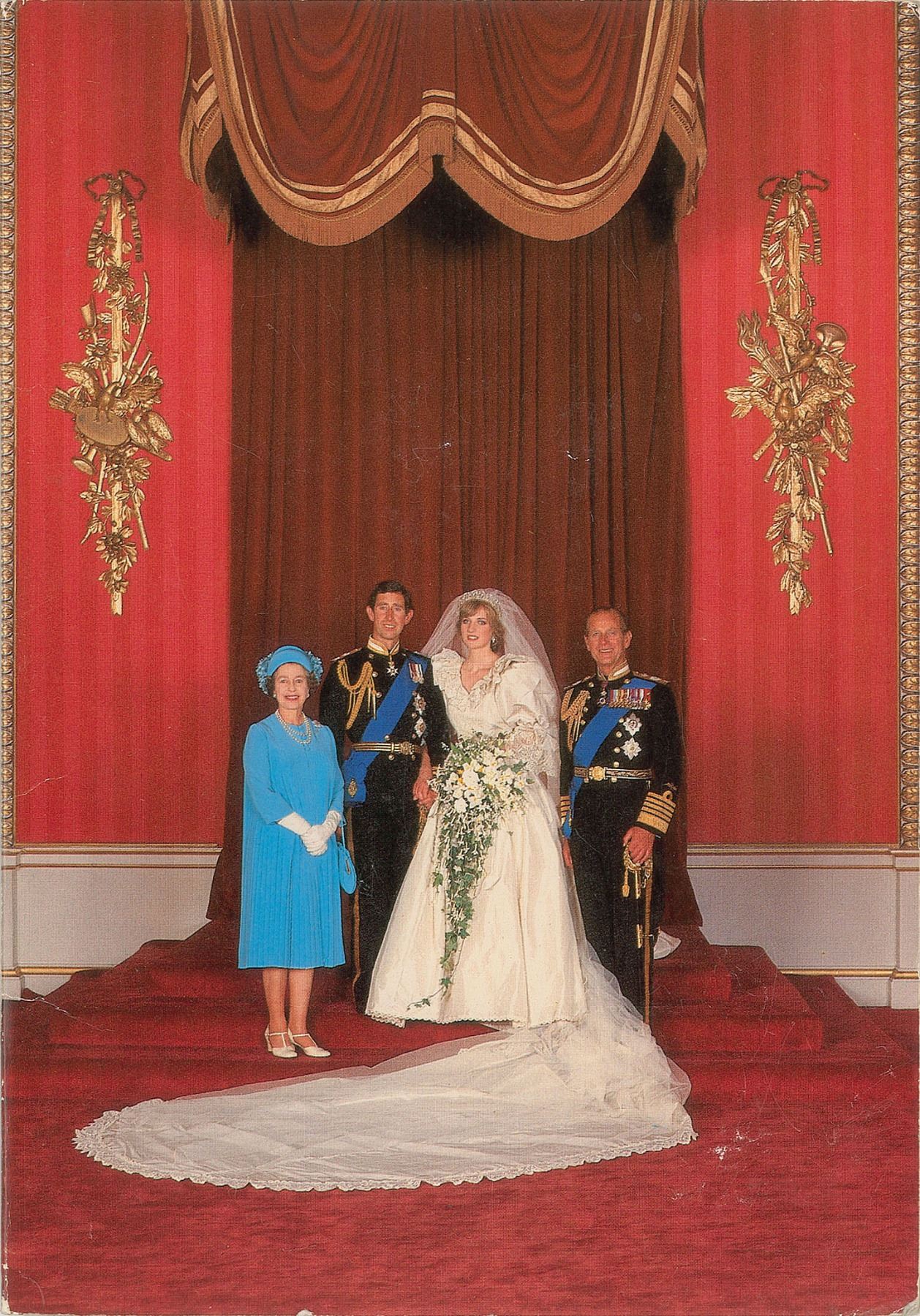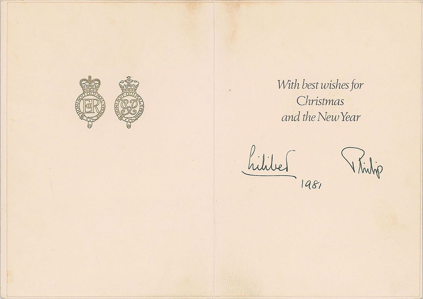 Scarce Royal Christmas and New Year card from 1981, with the front featuring a delightful color image of Queen Elizabeth II and Prince Philip posing alongside the newly wedded Princess Diana and Charles, Prince of Wales, measures 12 x 8.5 open, signed inside in fountain pen, “Lilibet, 1981." The Prince Philip signature is autopen. In fine condition, with some light soiling. An especially interesting signature from the queen, as she only ever signs with her nickname, "Lilibet," for very close friends and family. She was given the nickname as a young child, and it is essentially only her immediate family members who are permitted to use it.