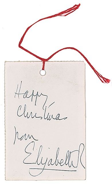 Uncommon color 2 x 3 Christmas gift tag with a nativity scene on the front, signed on the reverse in black ballpoint, "Happy Christmas, from Elizabeth R." In fine condition.
