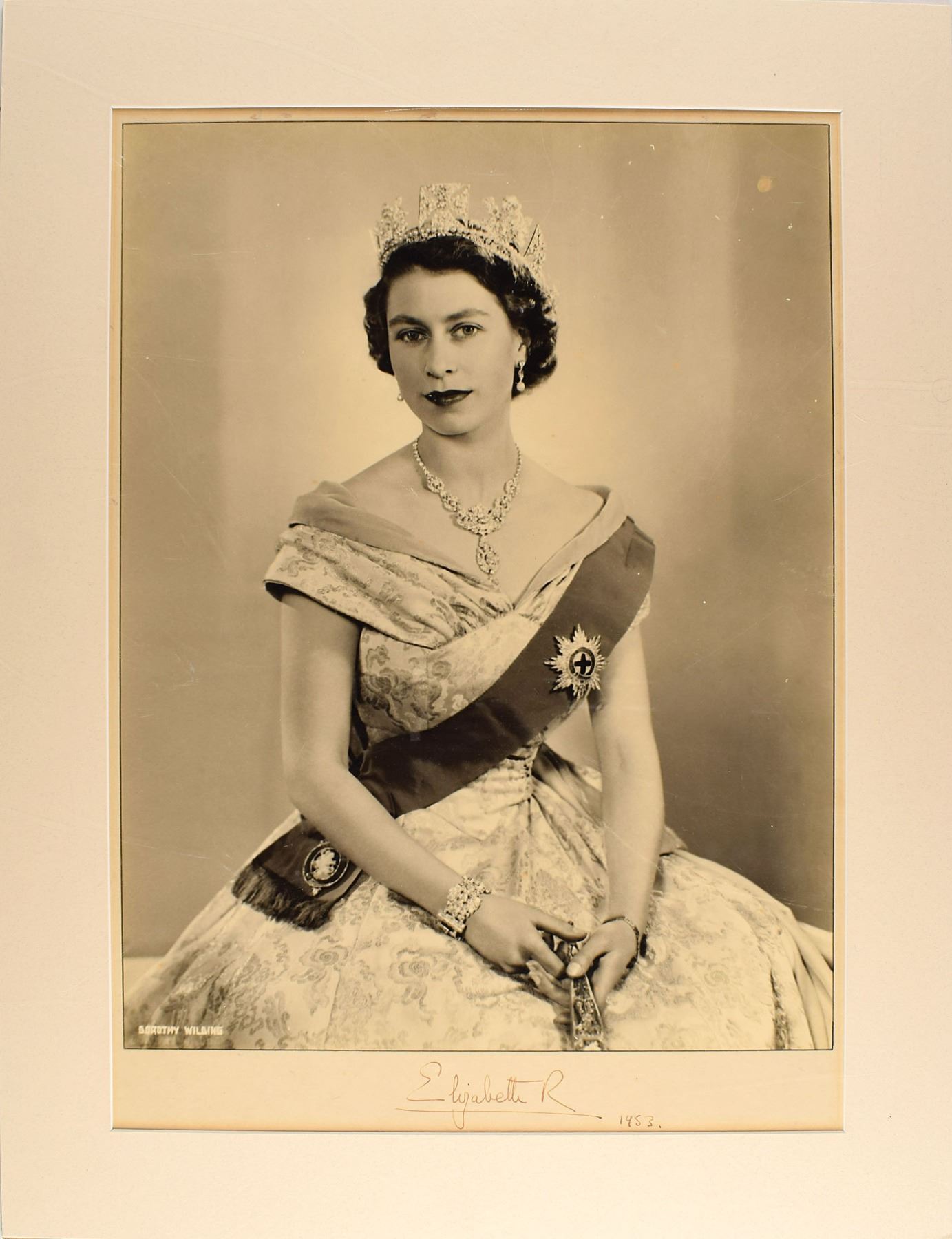Amazing oversized matte-finish 15 x 19.5 portrait of Queen Elizabeth II wearing her glimmering crown jewels by Royal Court photographer Dorothy Wilding, affixed to its original 20.25 x 26.5 mount, neatly signed on the mount in fountain pen, "Elizabeth R, 1953." Reverse of the mount bears Wilding's studio label. Matted to an overall size of 20.25 x 26.5, covering the borders of the original mount. In very good to fine condition, with toning to the edges of the photos, and scattered light staining and flecks of emulsion loss. An absolutely stunning, impressively large portrait of the queen.