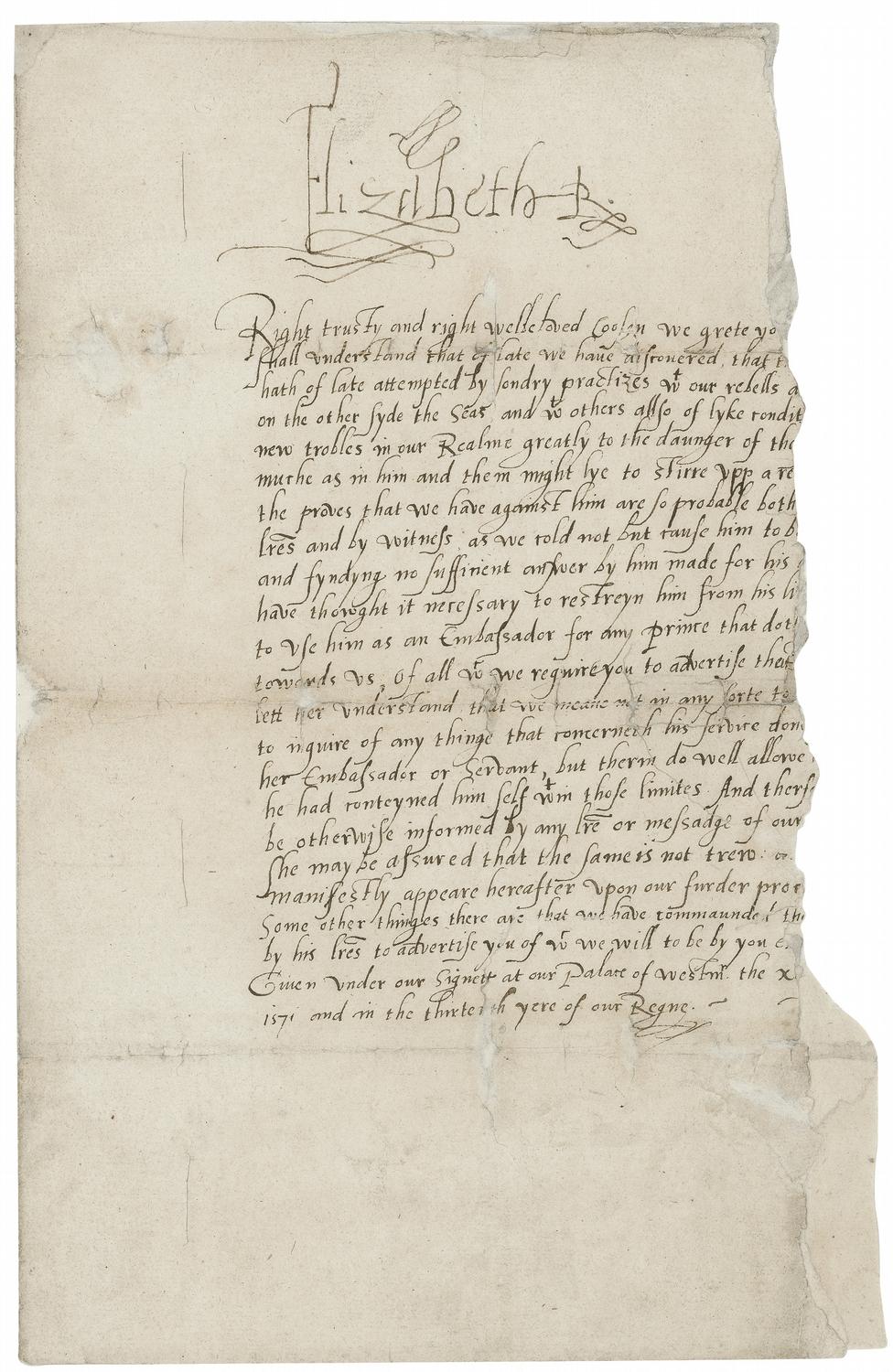 Very rare partial LS in Old English, signed “Elizabeth R,” one page, 7.5 x 12, 1571. Paper loss along the right side has affected the end of each line of letter. Letter to the Earl of Shrewsbury, who at the time of this letter was the guardian of Mary, Queen of Scots. In part: “Right trusty and welbeloved coosen we grete…shall understand that if late we have discovered that…hath of late attempted by sondry prctices w our rebells…on the other syde the seas and w others allso of lyke…new trobles in our Realme greatly to the danger of the…muche as in him and them might lye to stirre up a…the proves that we have against him are so probable both…and by witness as we told not but…and fyndyng no sufficient answer by him made for his…have thought it necessary to restreyn him from his…to use him as an Embassador for any prince that…towards us of all w we require you to advertise that…understand that we meane not in any sorte to…to inquire of any thinge that concerneth his service…her Embassador or servant but therin do well allowe…he had conteyned him self win those limits and…be otherwise informed by any…message of our…She may be assured that the same is not trew…manifestly appeare hereafter upon our furder…some other thinges there are and that we have commanded…by his…to advertise you of w we will to be by you…Given under our signet at our palace of Westm. The…1571 and in the thirteenth year of our Regne.” Second integral page bears a small address panel to the Earl of Shrewsbury, as well as a more contemporary endorsement in an unknown hand summarizing the letter as being “About the B[ishop] of Rosses restraint.” In very good condition, with aforementioned paper loss to right edge, scattered light toning and soiling, several repaired creases and holes, a couple lightly affecting portions of text but not readability, and several repairs and areas of restoration to second integral page.