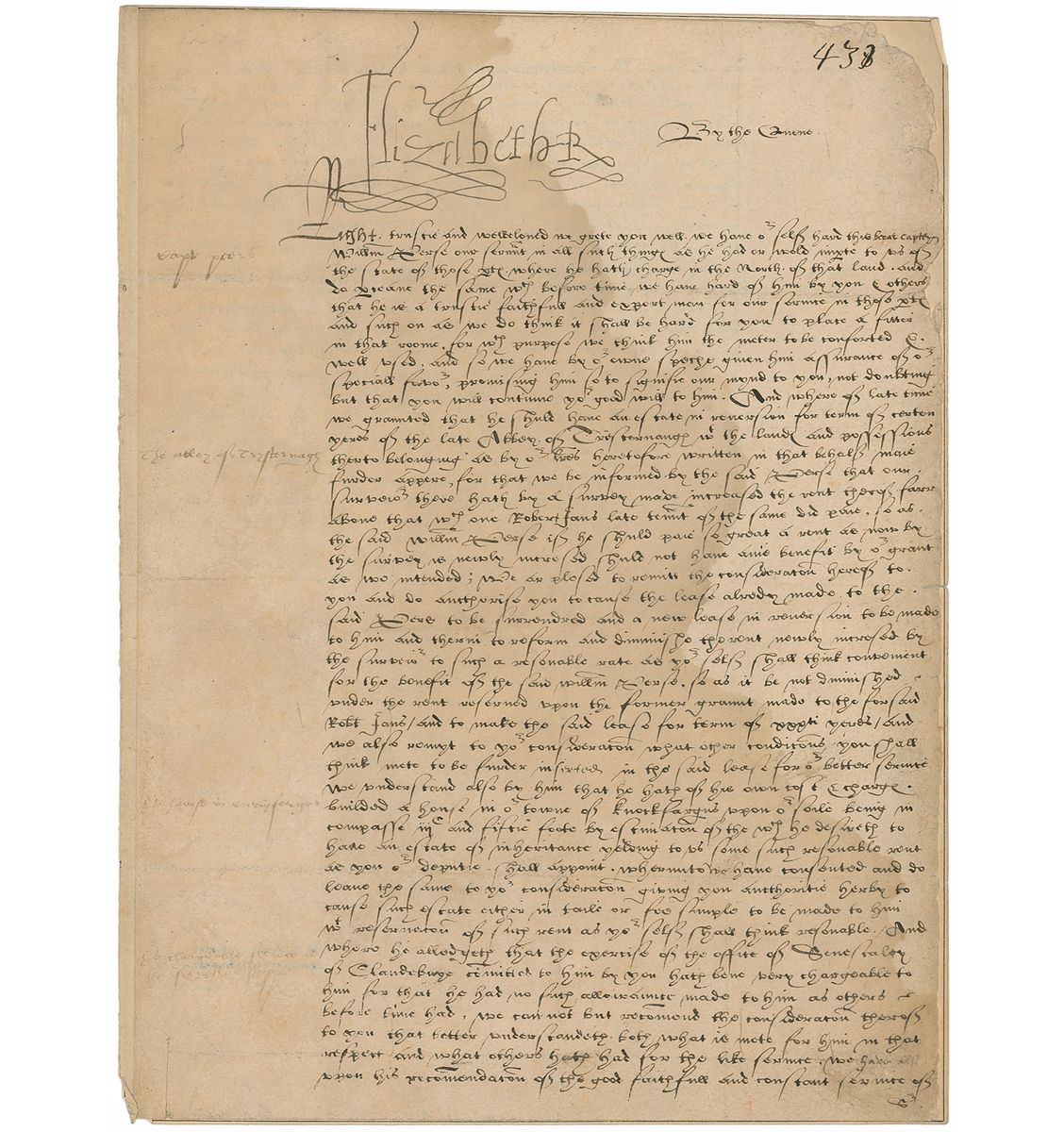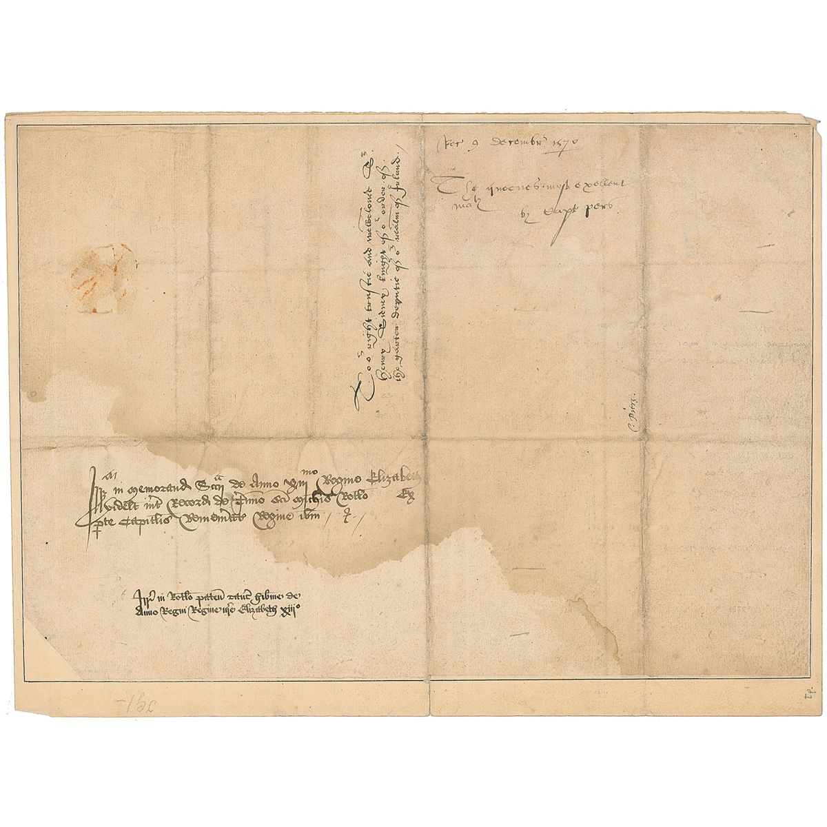 The man featured in this letter, William Piers (c. 1510–1603), was an English constable sent to Ireland by Queen Elizabeth in 1566. Especially noted for his attempts to drive the Scots from Ulster, he was appointed governor of Carrickfergus [Knockfargus] in 1568. The reasons for the requests of special treatment in this document can be ascertained from Burke's Peerages and Baronetcies, which describes Piers as 'a distinguished soldier and a great favorite of Queen Elizabeth' who 'on more than one occasion saved her from the vengeance of her step-sister, Queen Mary.' Captain Piers clearly ingratiated himself with Elizabeth by at times protecting her from the wrath of 'Bloody Mary,' thus earning her favor and a lifetime of substantial support. Recognizing Piers for his outstanding service, the Queen rewarded him with a large land grant which included the grounds of Tristernagh Abbey—a generous endowment apparently undermined by the recent appraisal of the property. In order to correct this, she not only orders Sidney to cut the recently increased rent, but asks that he offer Piers a low rate for his second property and provide him with additional renumeration due in the form of gold. An extraordinarily rare and truly remarkable document with incredible content and intimate associations. Oversized.