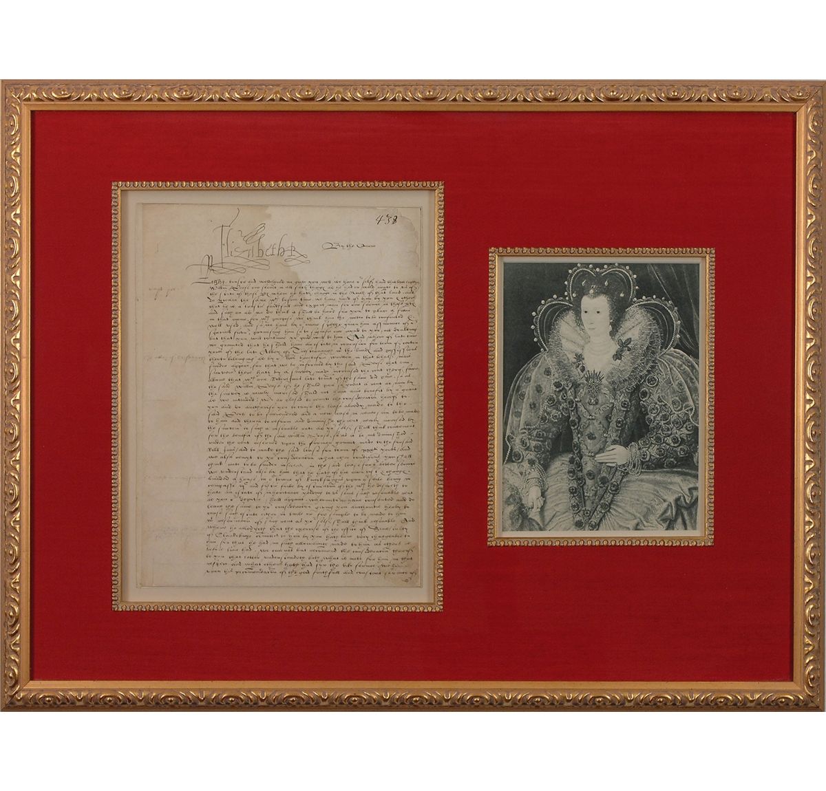 Queen regnant of England and Ireland (1533–1603), daughter of Henry VIII, who reigned from November 17, 1558, until her death. Extremely rare manuscript DS, in Early Modern English, boldly signed at the top, “Elizabeth R,” one page both sides, 9 x 12, September 4, 1570. Elizabeth orders Sir Henry Sidney, Lord Deputy of Ireland, to help rectify financial issues being had by William Piers. Lengthy document states, in part (spelling and grammar retained): "Right trustie and welbeloved we grete you well, we have our self hard this bearer capteyn William Perse…where of late time we graunted that he shuld have an estate in reversion for term of certen yeres of the late Abbey of Tresternaugh with the land and possessions thereto belonging…we be informed by the said Perse that our surveior there hath by a survey made increased the rent therof farr above that which one Robert Jans late tenant of the same did paie, so as the said William Perse if he shuld paie so great a rent as now by the survey is newly incresed shuld not have anie benefit by our grant as we intended; we ar plesed to remitt the consideration hereof to you…to reform and diminishe the rent newly incresed by the surveior to such a resonable rate as your self shall think convenient for the benefit of the said William Perse…we understand also by him that he hath of his own cost & charge builded a house in our towne of Knockfargus upon our soile…and do leave the same to your consideration giving you authoritie herby to cause such estate either in taile or fee simple to be made to him with reservation of such rent as your self shall think resonable…we have also upon his recommendation of the good faithfull and constant service of Sir Bryan Mackphellyme caused that ether a cheine of gold or a portion of plate of the value of fortie poundes shuld be delivered to the said Pers to be in our name speciallie by him given to the said Mackphellym…we have also taken order for the satisfaction of the said Perse for his demand of money due as he hath informed our councell…thus you maie see how we are favorably disposed toward our said servant thinking him worthy of all this our favor." Reverse of second integral page is docketed in several different hands. Beautifully archivally cloth-matted and framed with a portrait of the Queen to an overall size of 25.75 x 20. In very good condition, with mild dampstaining to both pages (some over the signature, but not affecting the boldness or legibility of the signature or document whatsoever), small separation and reinforcement along hinge, slight paper loss to right edge of first page, second integral page professionally inlaid to a slightly larger sheet, and two W. C. Putnam Collection stamps to reverse of first page and front of second integral page.