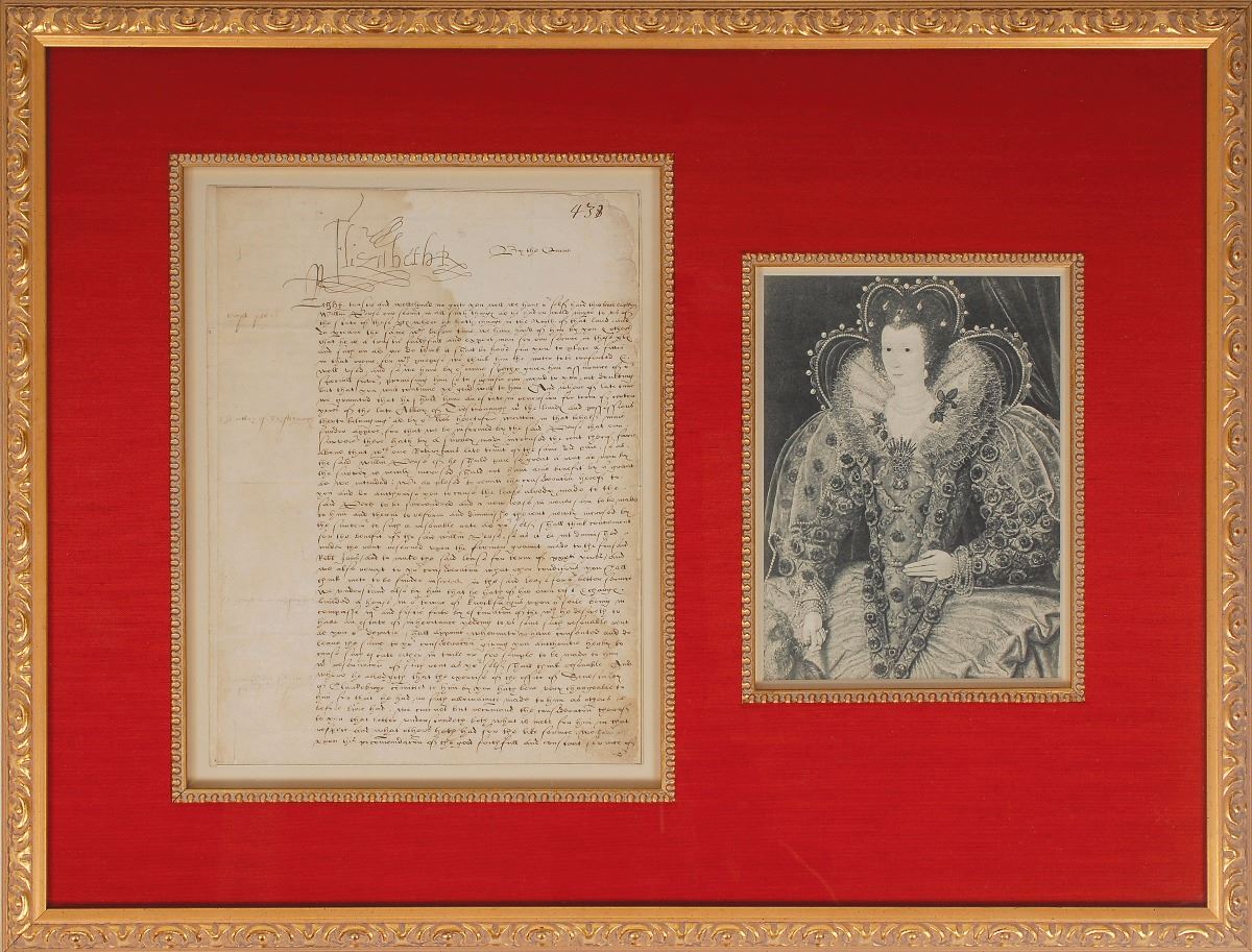 Extremely rare manuscript DS, in Early Modern English, boldly signed at the top, “Elizabeth R,” one page both sides, 9 x 12, September 4, 1570. Elizabeth orders Sir Henry Sidney, Lord Deputy of Ireland, to help rectify financial issues being had by William Piers. Lengthy document states, in part (spelling and grammar retained): "Right trustie and welbeloved we grete you well, we have our self hard this bearer capteyn William Perse…where of late time we graunted that he shuld have an estate in reversion for term of certen yeres of the late Abbey of Tresternaugh with the land and possessions thereto belonging…we be informed by the said Perse that our surveior there hath by a survey made increased the rent therof farr above that which one Robert Jans late tenant of the same did paie, so as the said William Perse if he shuld paie so great a rent as now by the survey is newly incresed shuld not have anie benefit by our grant as we intended; we ar plesed to remitt the consideration hereof to you…to reform and diminishe the rent newly incresed by the surveior to such a resonable rate as your self shall think convenient for the benefit of the said William Perse…we understand also by him that he hath of his own cost & charge builded a house in our towne of Knockfargus upon our soile…and do leave the same to your consideration giving you authoritie herby to cause such estate either in taile or fee simple to be made to him with reservation of such rent as your self shall think resonable…we have also upon his recommendation of the good faithfull and constant service of Sir Bryan Mackphellyme caused that ether a cheine of gold or a portion of plate of the value of fortie poundes shuld be delivered to the said Pers to be in our name speciallie by him given to the said Mackphellym…we have also taken order for the satisfaction of the said Perse for his demand of money due as he hath informed our councell…thus you maie see how we are favorably disposed toward our said servant thinking him worthy of all this our favor." Reverse of second integral page is docketed in several different hands. Beautifully archivally cloth-matted and framed with a portrait of the Queen to an overall size of 25.75 x 20. In very good condition, with mild dampstaining to both pages (some over the signature, but not affecting the boldness or legibility of the signature or document whatsoever), small separation and reinforcement along hinge, slight paper loss to right edge of first page, second integral page professionally inlaid to a slightly larger sheet, and two W. C. Putnam Collection stamps to reverse of first page and front of second integral page.