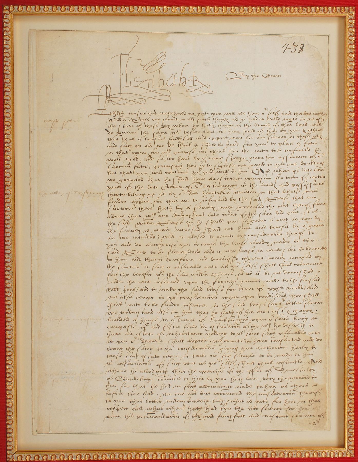 Extremely rare manuscript DS, in Early Modern English, boldly signed at the top, "Elizabeth R," one page both sides, 9 x 12, September 4, 1570. Elizabeth orders Sir Henry Sidney, Lord Deputy of Ireland, to help rectify financial issues being had by William Piers. Lengthy document states, in part (spelling and grammar retained): "Right trustie and welbeloved we grete you well, we have our self hard this bearer capteyn William Perse...where of late time we graunted that he shuld have an estate in reversion for term of certen yeres of the late Abbey of Tresternaugh with the land and possessions thereto belonging...we be informed by the said Perse that our surveior there hath by a survey made increased the rent therof farr above that which one Robert Jans late tenant of the same did paie, so as the said William Perse if he shuld paie so great a rent as now by the survey is newly incresed shuld not have anie benefit by our grant as we intended; we ar plesed to remitt the consideration hereof to you...to reform and diminishe the rent newly incresed by the surveior to such a resonable rate as your self shall think convenient for the benefit of the said William Perse...we understand also by him that he hath of his own cost & charge builded a house in our towne of Knockfargus upon our soile...and do leave the same to your consideration giving you authoritie herby to cause such estate either in taile or fee simple to be made to him with reservation of such rent as your self shall think resonable...we have also upon his recommendation of the good faithfull and constant service of Sir Bryan Mackphellyme caused that ether a cheine of gold or a portion of plate of the value of fortie poundes shuld be delivered to the said Pers to be in our name speciallie by him given to the said Mackphellym...we have also taken order for the satisfaction of the said Perse for his demand of money due as he hath informed our councell...thus you maie see how we are favorably disposed toward our said servant thinking him worthy of all this our favor." Reverse of second integral page is docketed in several different hands. Beautifully archivally cloth-matted and framed with a portrait of the Queen to an overall size of 25.75 x 20. In very good condition, with mild dampstaining to both pages (some over the signature, but not affecting the boldness or legibility of the signature or document whatsoever), small separation and reinforcement along hinge, slight paper loss to right edge of first page, second integral page professionally inlaid to a slightly larger sheet, and two W. C. Putnam Collection stamps to reverse of first page and front of second integral page.