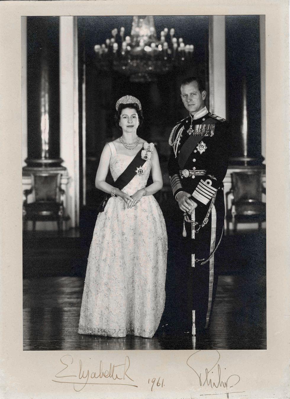 Signed photo of Her Majesty Queen Elizabeth ll and Prince Philip. The Queen is in a formal ball gown and crown, while the Prince is in formal military wear, appearing regal and composed. Signed ''Elizabeth 1961'' and ''Philip'' on mat below their respective images. Black and white photograph measures 9'' x 12''. Mild fading to ink in signatures, else excellent.