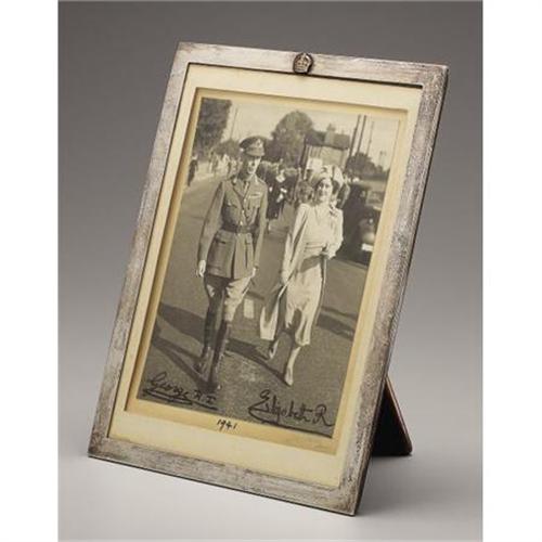 <B>Royal Presentation King George VI and Queen Elizabeth Silver-Gilt Photograph Frame</B></I><BR><I>Marked Turner & Simpson Ltd. Birmingham, 1939</B></I><BR><BR>The silver rectangular frame applied with gold crown enclosing original photograph of the George VI, King of Great Britain (r. 1936-1952) wearing army uniform, strolling with his consort, Queen Elizabeth (1900-2002) who is wearing a light colored dress and overcoat signed <I>George R. I. </B></I>and <I>Elizabeth R</B></I> above the date <I>1941</B></I>-8 x 6 1/4 in.; the frame 11 1/2 x 8 1/2 in.<BR><BR><BR><b>Shipping:</b> Requires 3rd Party Shipping (<a target="_blank" href="http://www.heritageauctions.com/common/shipping.php">view shipping information</a>)