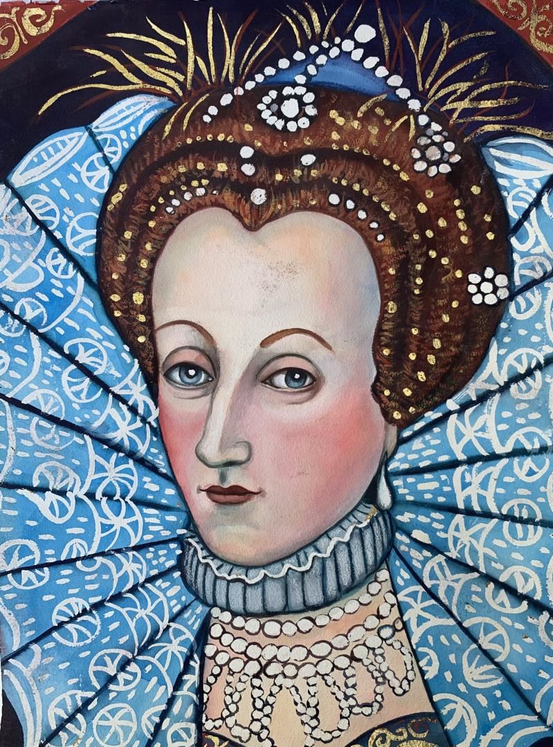 A pastel & watercolor portrait of the young Queen, daughter of Henry VIII, who ushered in the Elizabethan era. 24x18" on deckled fine art paper, by Anonymous