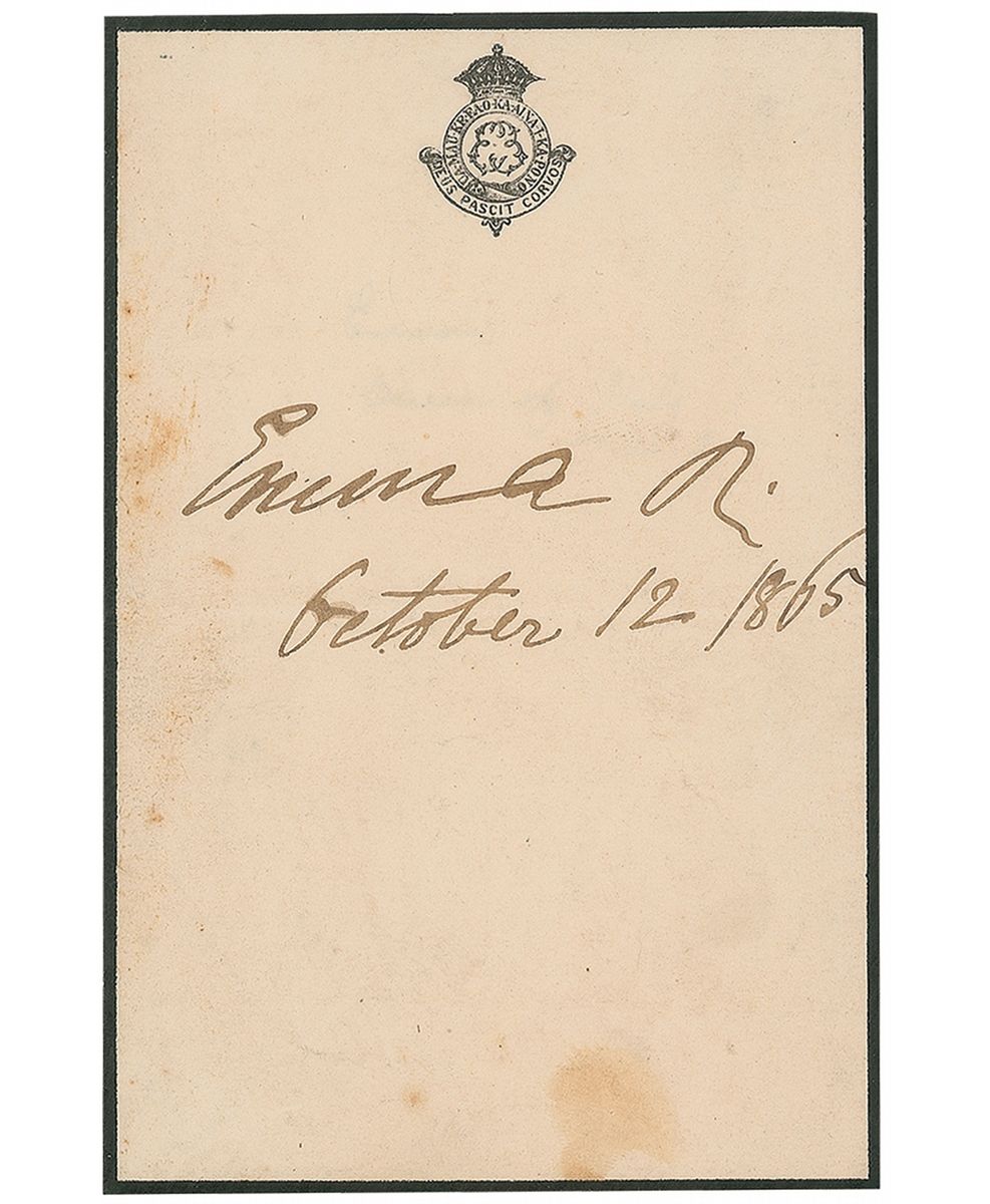 Queen consort (1836–1885) of King Kamehameha and the last queen of Hawaii. Rare ink signature, “Emma R, October 12, 1865,” on an off-white 3.5 x 5.25 sheet of black-bordered stationery. Unobtrusive light stains to edges, otherwise fine condition.