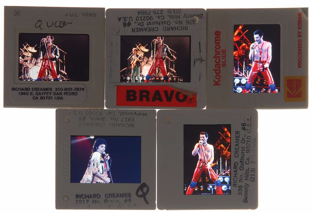 Collection of five color 35mm slides by Richard Creamer, all depicting Mercury singing on stage during Queen’s energetic live performances; multiple slides show him entirely shirtless. In overall fine condition. Provenance: Richard Creamer Estate.