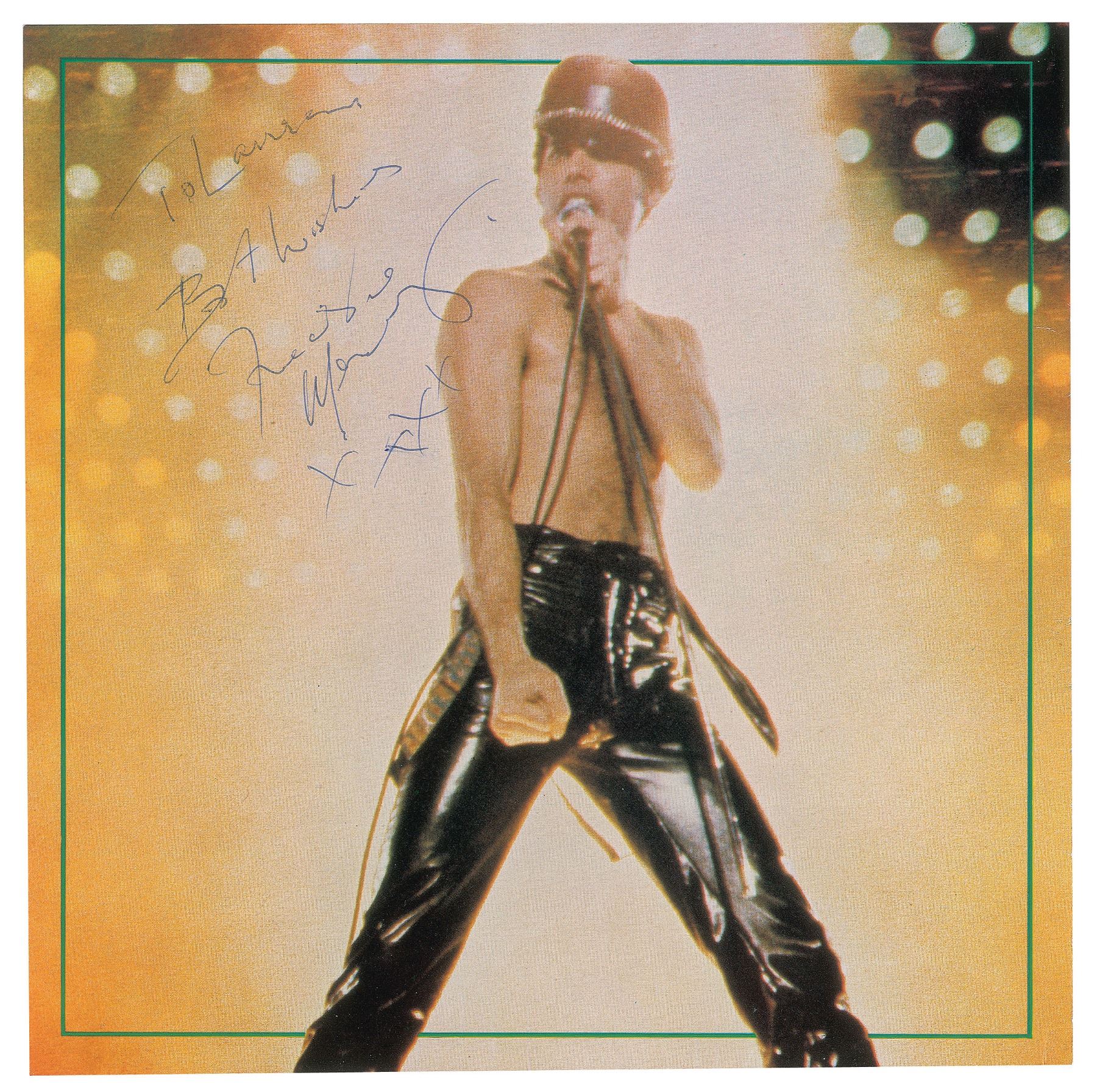 Very desirable color glossy 9.5 x 9.5 program photo of the Queen frontman performing passionately under bright stage lights, signed and inscribed in blue ballpoint, "To Lauren, Best wishes, Freddie Mercury, xxxx.” In fine condition, with light handling wear.