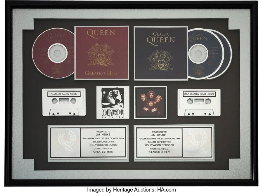 QueenGreatest Hits/Classic QueenDual Platinum Award. Two album awards in one frame, presented to a former Rolling Stonewriter and Rock N' Roll Hall of Fame curator, Jim Henke. The Greatest Hitsaward is for one million copies sold, while the Classic Queenaward is for two million copies sold.