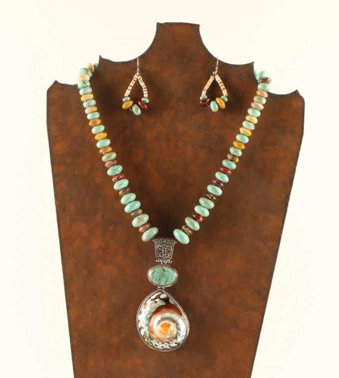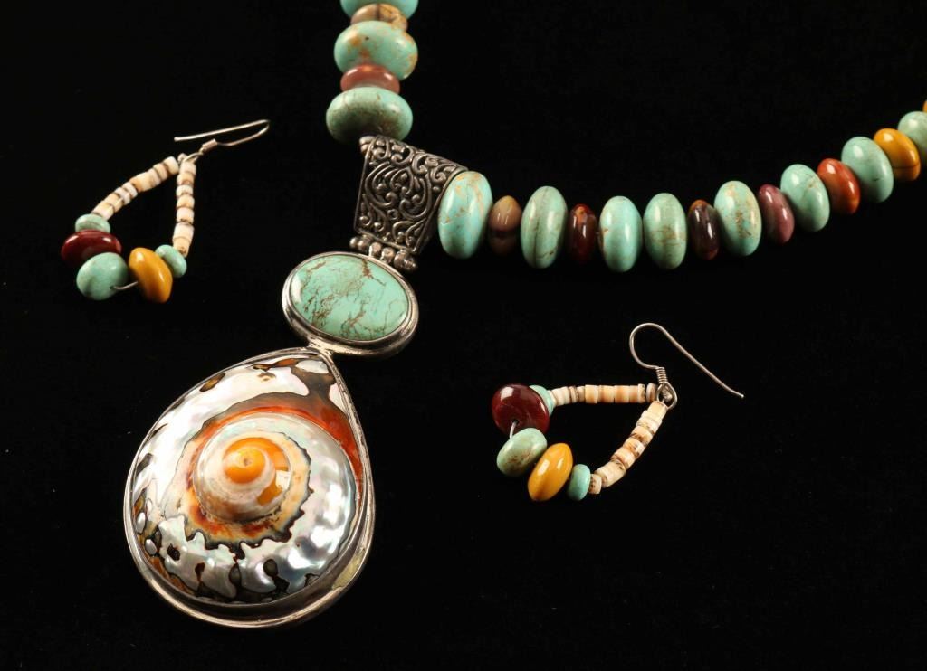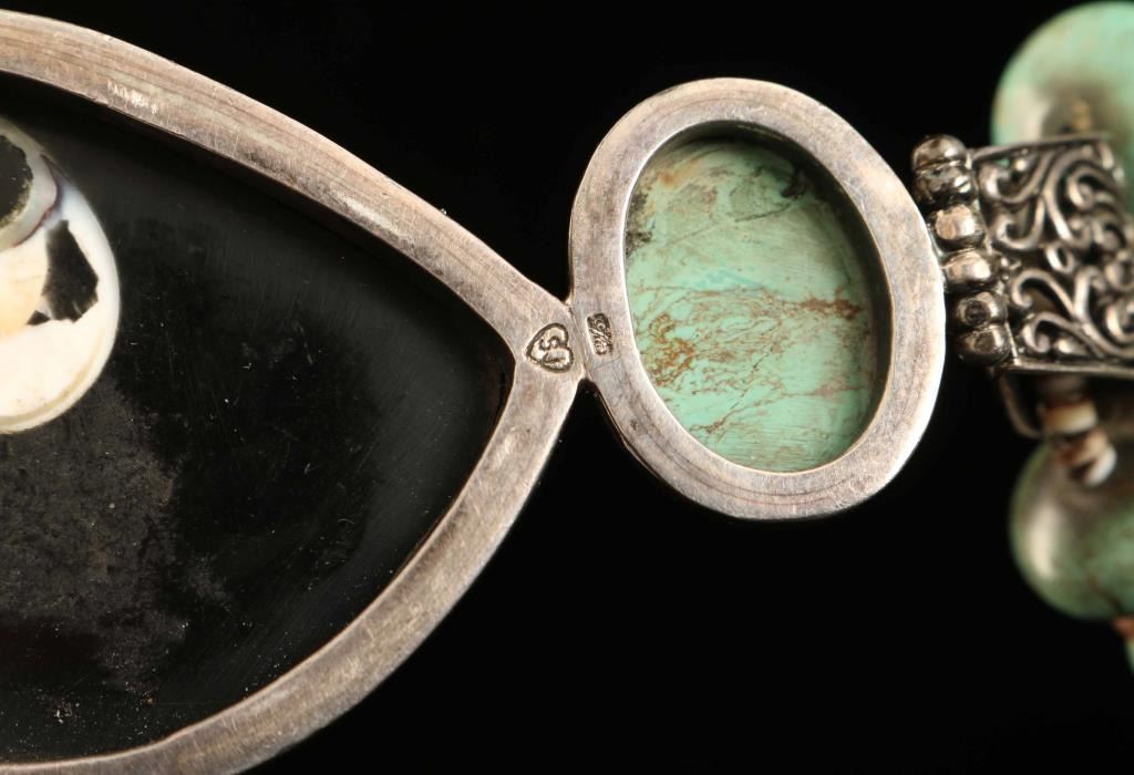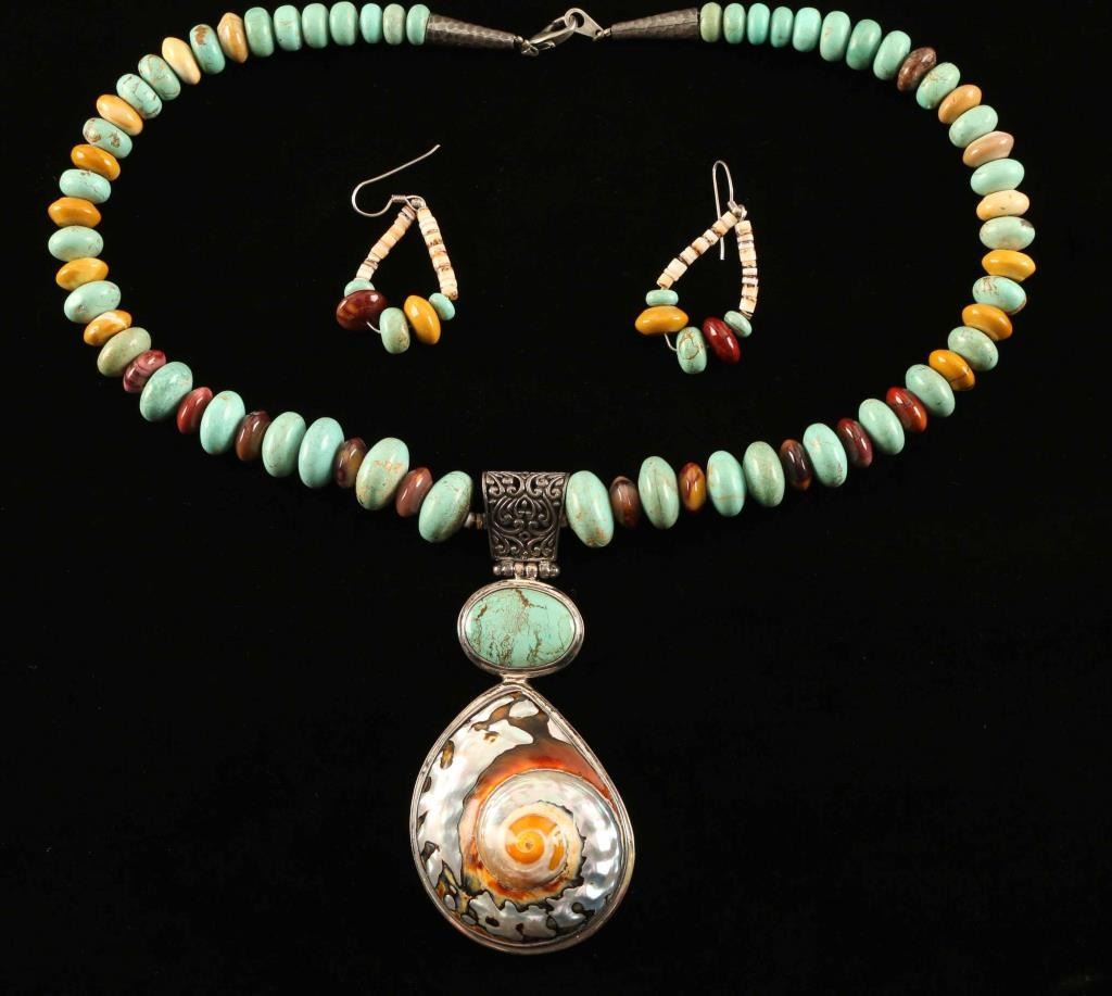 Beautiful iridescent shell with shades of orange with a single Evans Mine turquoise cab above it 4"l x 1 1/2"w suspended from turquoise and Monkite agate beads. Artist's hallmark and '.925'. Comes with matching beaded loops.