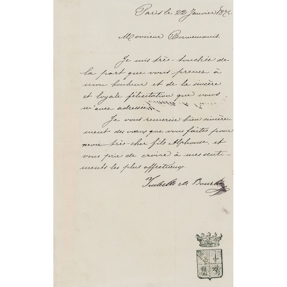 Queen of Spain (1830–1904) who came to the throne as an infant in 1833 and reigned until 1868 when she was deposed in the Glorious Revolution. LS in French, signed “Isabella de Bourbon,” one page, 5 x 8, January 22, 1879. Untranslated letter signed at the conclusion by Isabella II, sent from Paris during her exile. In fine condition.