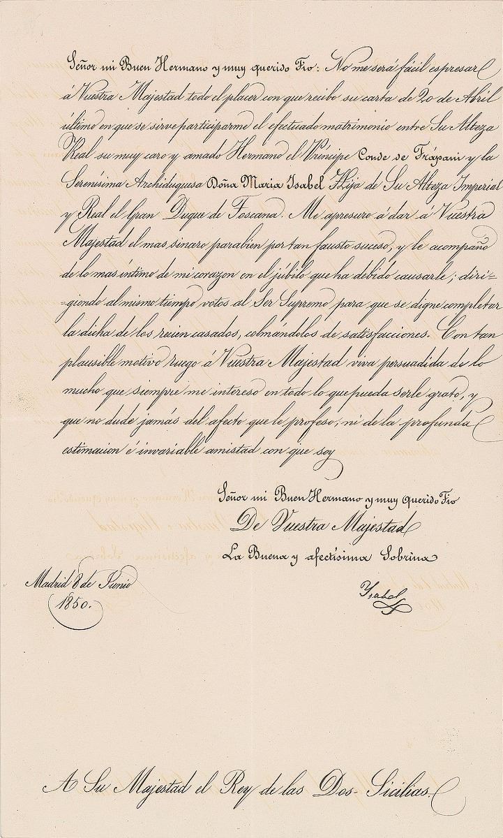 Queen of Spain (1830–1904) who came to the throne as an infant in 1833 and reigned until 1868 when she was deposed in the Glorious Revolution. LS in Spanish, signed “Isabel,” one page, 8.75 x 11, June 8, 1850. Letter to King Ferdinand II of the Two Sicilies, expressing her best wishes to him on the marriage of his son. In fine condition.