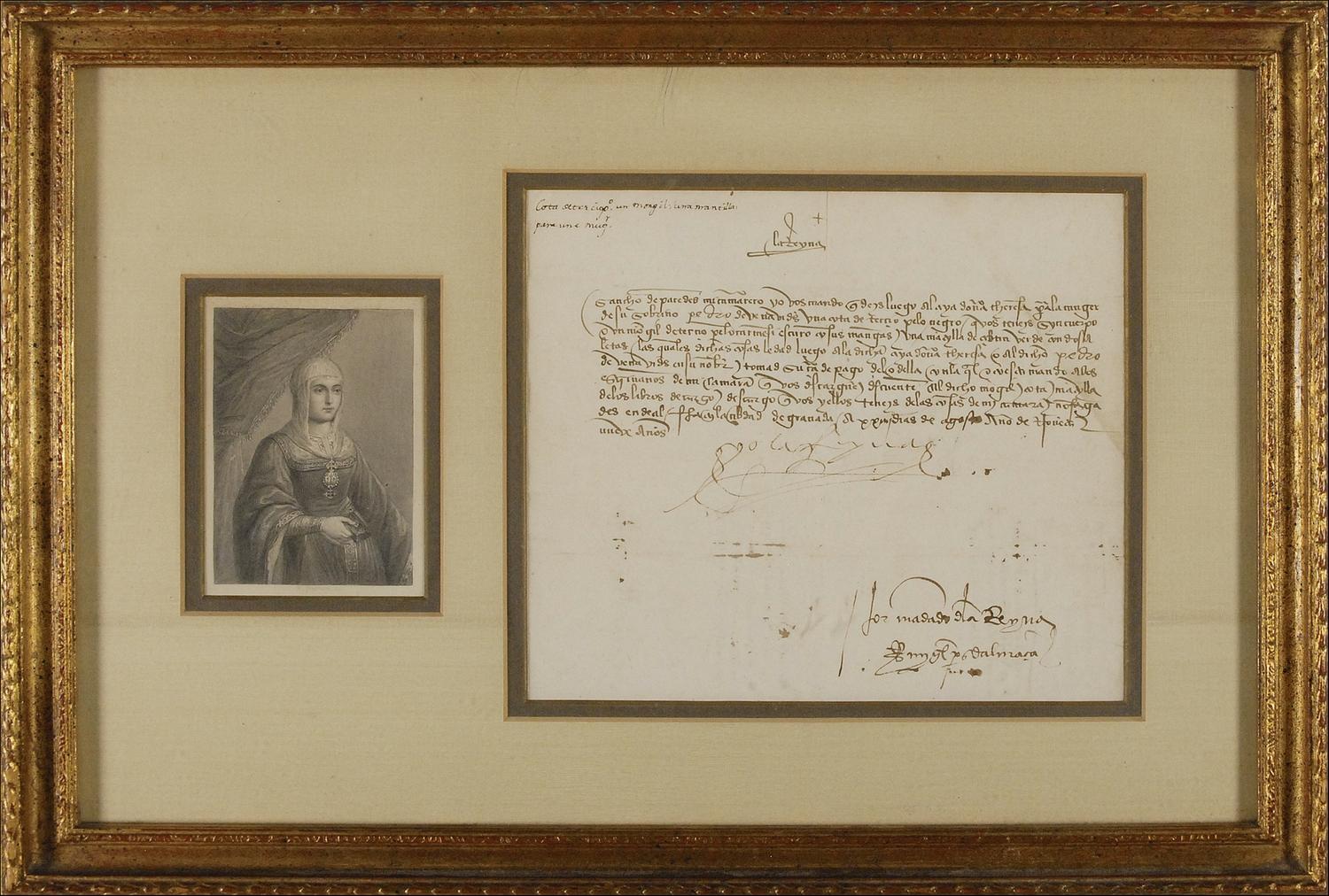 Spanish monarch (1451–1504) best known as the sponsor and patron of Christopher Columbus in his ventures to the ‘New World.’ Manuscript DS, in Old Spanish, signed “Yo La Reyna [I the Queen],” one page, 8.5 x 7.5. Crisply penned untranslated document, signed under the text by Isabella. Double matted and framed with a portrait of the Queen to an overall size of 18.5 x 12.5. Central horizontal and vertical folds, one through a single letter of signature, two cancellation cuts to text, each affecting a single letter of signature, and scattered toning and wrinkling, otherwise very good condition. Historic connection with the discoverer of the New World.
