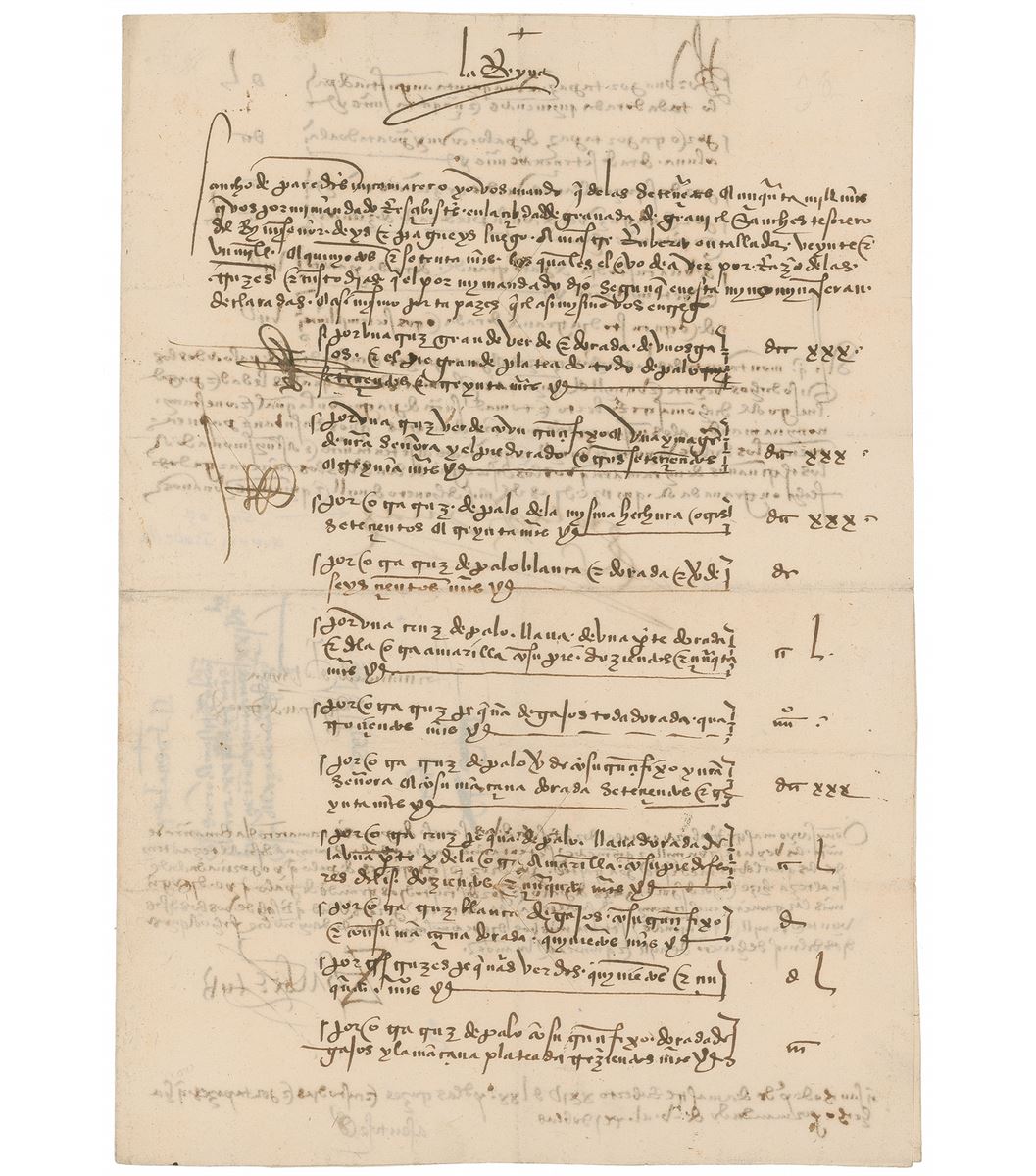 Queen Isabella famously offered to sell her crown jewels to pay for Columbus’s expedition, but her advisers assured her there were other ways to finance the journey. That this document concerns jeweled crosses is of particular interest as Isabella and Ferdinand are known for embarking on a process of spiritual unification in Spain with the Spanish Inquisition, trying to bring the country under the single faith of Roman Catholicism during the period this document was signed. Isabella was also astute in managing the nation’s finances, making a financial document such as this especially desirable.
