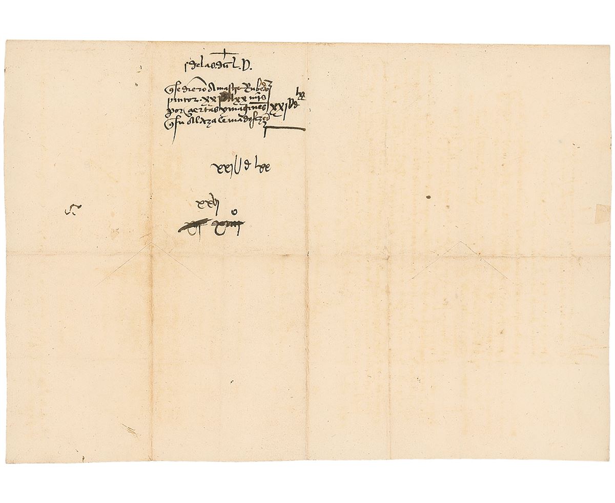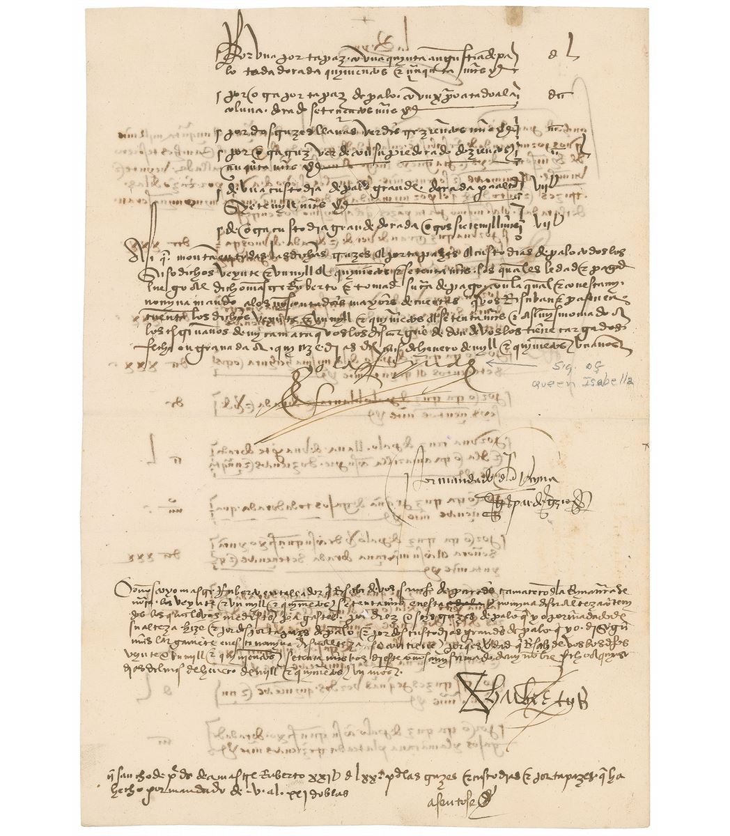 Manuscript DS in Spanish, signed “Yo la Reyna,” one page both sides, 8 x 11.75, January 15, 1501. Document ordering the queen’s chamberlain, Sancho de Paredes, to pay an engraver for crosses supplied to the queen, listing the characteristics of each piece such as size and shape, and whether they were jeweled or gilded. Signed at the conclusion by Queen Isabella and countersigned below by her secretary Gaspar de Trizio. In very good condition, with show-through from writing to opposing sides, two cancellation cuts to the body, and a spot of adhesive remnants to the top edge.
