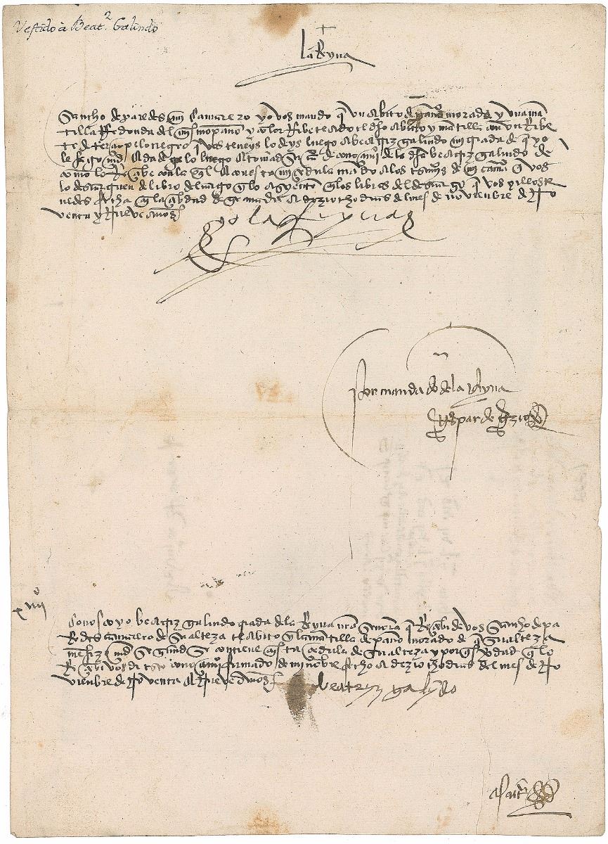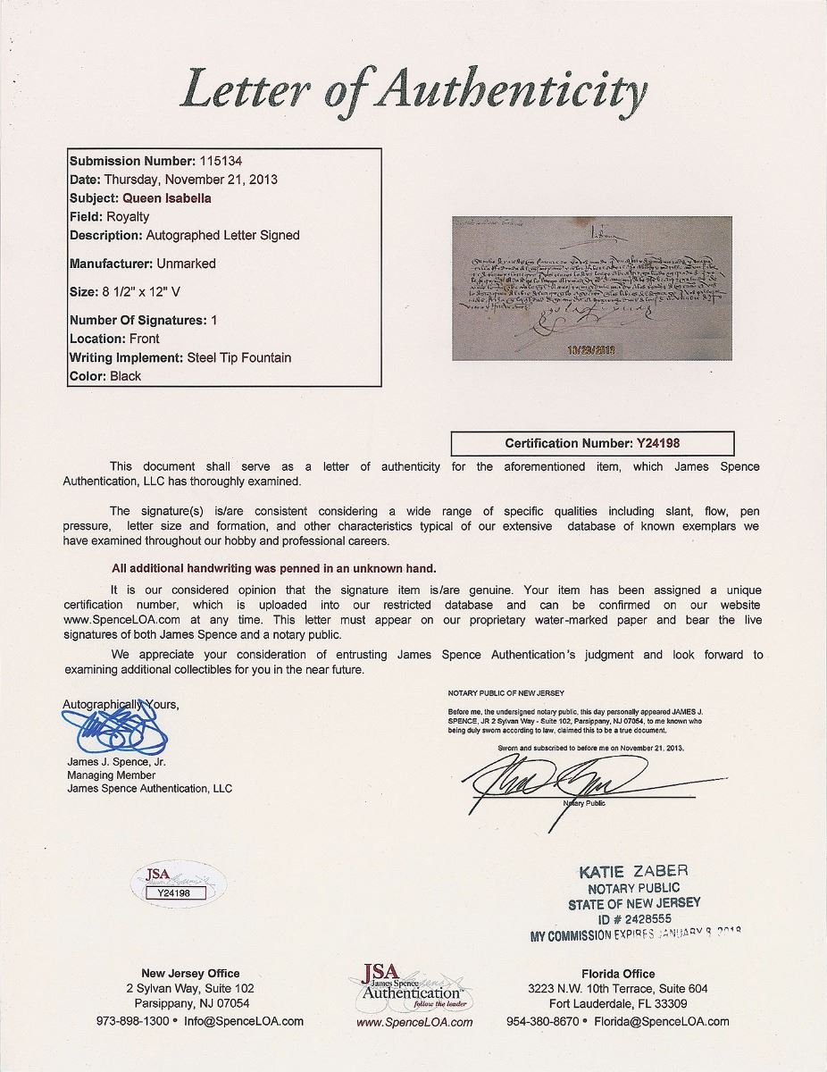 Untranslated manuscript DS in Spanish, signed “Yo la Reyna,” one page, 8.5 x 12, no date. In very good to fine condition, with cancellation slits to the top and bottom repaired with tape to reverse; one cut passes through a portion of the signature but is practically indiscernible. An extremely desirable piece.