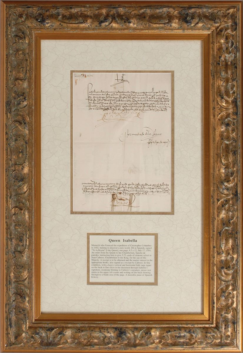 Manuscript DS in Spanish, signed “Yo la Reyna [I the Queen],” one page, 8.25 x 11.75, July 17, 1504. Order from the queen to her chamberlain, Sancho de Paredes, instructing him to give 5.75 yards of crimson velvet to Juan Cabrero, chamberlain to the king, for the use of his majesty. Signed below the first paragraph by the queen, and countersigned below by Cabrero. Ornately double-matted and framed with a descriptive plaque to an overall size of 20.75 x 30.25. In fine condition, with some light vertical creasing. In addition to being a companion of King Ferdinand, the influential Cabrero was also a close confidant to Christopher Columbus, and was instrumental in the latter’s subsequent voyages to the Indies. At the behest of Cabrero, the Catholic Monarchs, who an initially denied Columbus’s lofty ambitions, consented to the undertaking, a voyage Isabelle would famously fund not long after. In a 1504 letter, Columbus linked Cabrero to his discovery of the Indies. An exceptional document with strong historical associations, signed only three months before the queen’s untimely death.