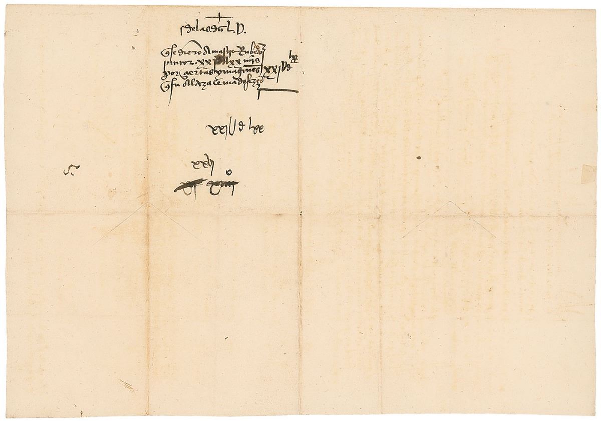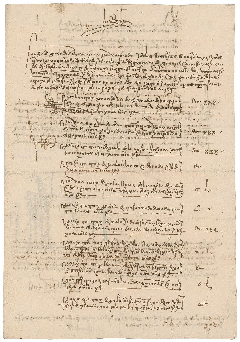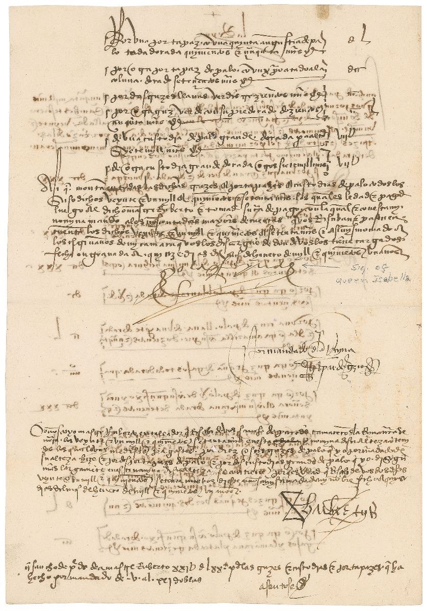 Manuscript DS in Spanish, signed “Yo la Reyna,” one page both sides, 8 x 11.75, January 15, 1501. Document ordering the queen’s chamberlain, Sancho de Paredes, to pay an engraver for crosses supplied to the queen, listing the characteristics of each piece such as size and shape, and whether they were jeweled or gilded. Signed at the conclusion by Queen Isabella and countersigned below by her secretary Gaspar de Trizio. In very good condition, with show-through from writing to opposing sides, two cancellation cuts to the body, and a spot of adhesive remnants to the top edge.