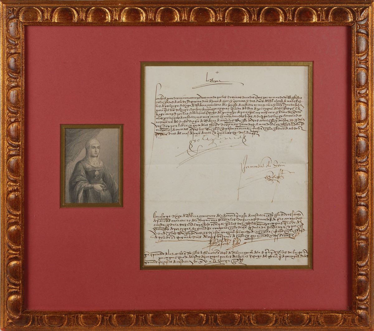 Manuscript DS in Spanish, signed “Yo la Reyna,” one page, 8 x 10, June 30, 1502. Royal decree ordering her chamberlain Sancho de Paredes to pay 200 ducats to Diego de Ribera, chamberlain of the Princess of Castile, so that he may give them to Gaspar de Payna, a servant of the king of Portugal, for gifts brought from her grandson, the prince of Portugal. Attractively double-matted and framed with an engraved portrait of the queen to an overall size of 19 x 17. In fine condition. An especially clean, attractive example of an Isabella document.