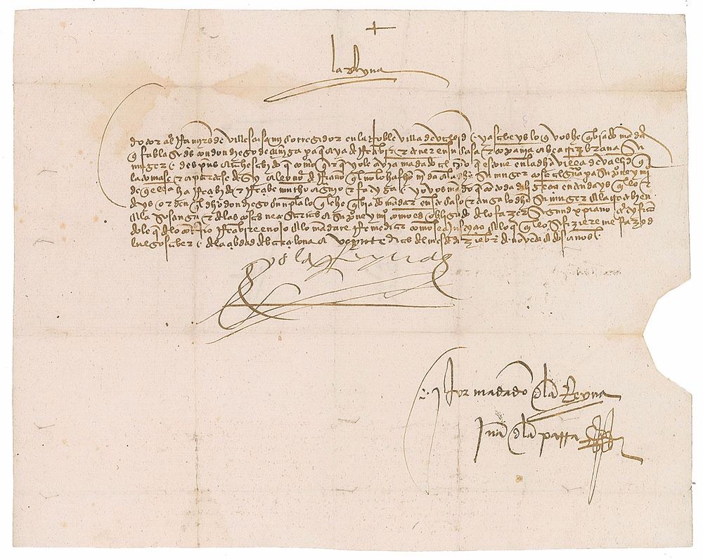 LS in Spanish, signed “Yo la Reyna,” one page, 8.75 x 7, December 20, 1492. Letter to Dr. Alfonso Ramires de Villaescusa, municipal royal representative in the town of Valladolid, in full (translated): "You already know that I have sent to order you to speak with Don Diego de Cuniga in order that he receive Beatriz Brana, his wife, and have her in his house and company. I have since learned here that, although I had ordered him at the time that I was in the said town of Valladolid that he take her and separate from Leonor de Riano, he had not done it, and neither does he give his said wife anything for her maintenance, from which she has received and receives much injury and labor. I order you to attend to this with all diligence and see to it that the said Don Diego complies with what I have sent to order in this case and has his said wife and treats her well and supports her and gives her the things necessary for her maintenance, as he is obligated to do as a Christian, assuring him that otherwise I will be angered and will order that the matter be remedied as may be just. And inform me at once about what us done in this matter.” In fine condition.