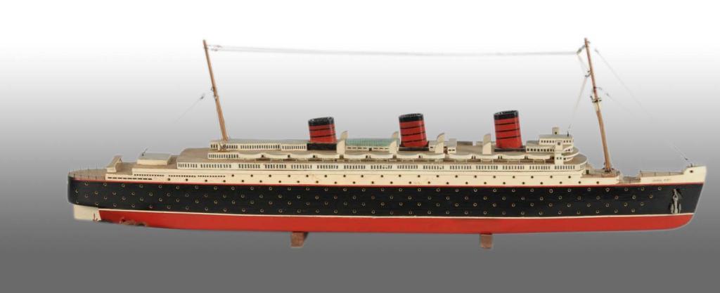 Circa 1930s. Scarce item made of wood with brass portholes. Original wood base, cardboard and wood box. Portholes light up. Incredible detail. Model is all original and complete. Boat Condition (Near Mint). Size 36" x 10".