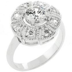 The Queen Mary features a milgrain style antique face with pave cubic zirconia circling a round cubic zircon center in silver tone. Its antique design make it rich with expression and old flavor. Genuine Rhodium Plating is achieved using an electroplating process that coats the item with heavy layers of rhodium a close cousin to platinum which gives this piece a platinum luster.Base Metal: Lead Free Alloy (Brass)Style: , Setting Type: PaveMaterials: , Stone Cut: RoundCarat Weight: 1.26 (ct)Color: , Plating Color: Silvertone FinishChain Clasp: 6.50Ring Band Width: 2.4 mmBracelet Size: 15 mm L x 15 mm W x 7 mm HStone Size: 6.2 mm| 2.2 mmType: Ring