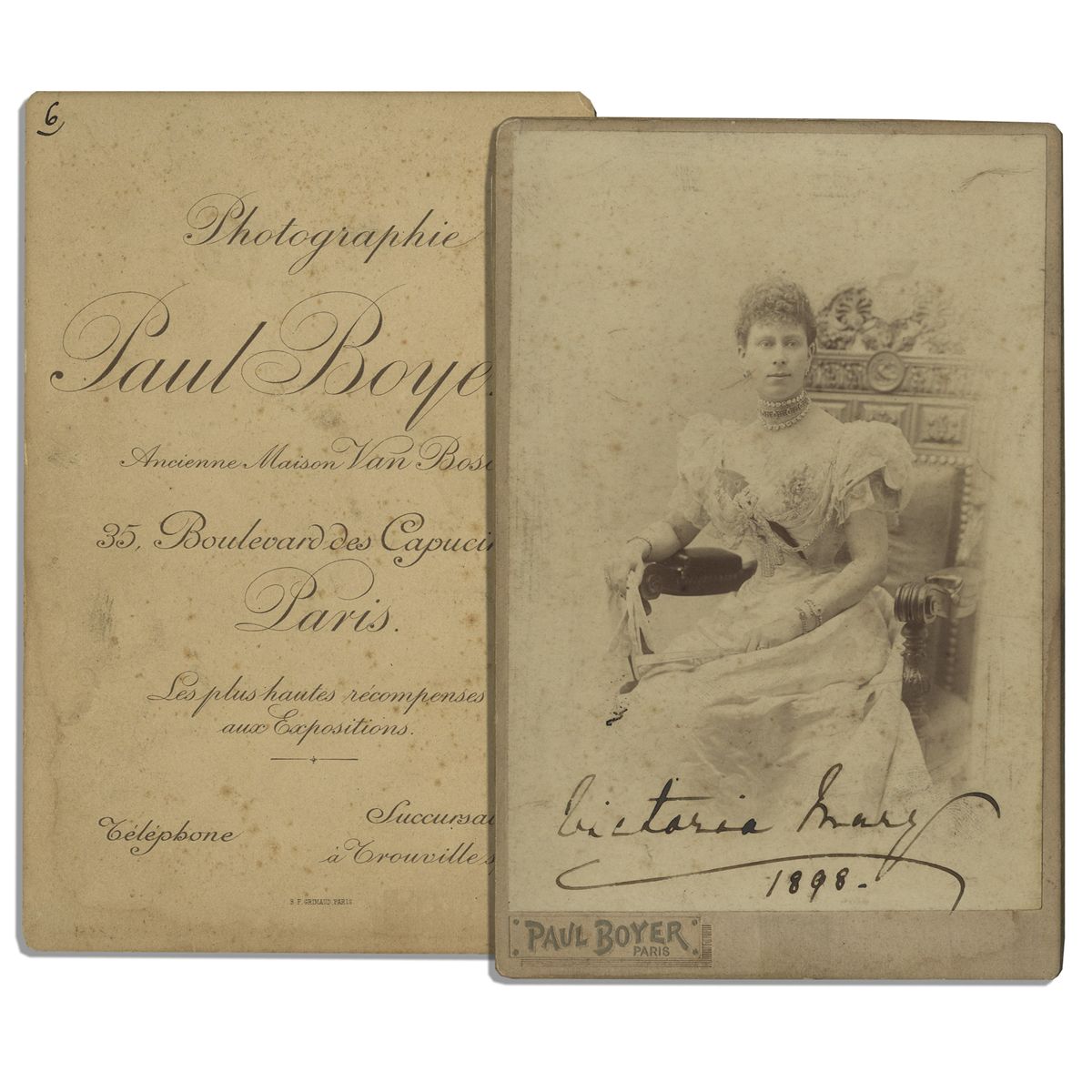 Queen Mary cabinet card signed. Image of Mary of Teck sitting for her portrait is signed ''Victoria Mary / 1898'' with her signature flourish between autograph and date. Photo bears the photographer's mark of Paul Boyer, Paris to verso and to the border below image. Measures 4.25'' x 6.5''. Foxing, toning and some fading with the most foxing to verso. Very good condition.